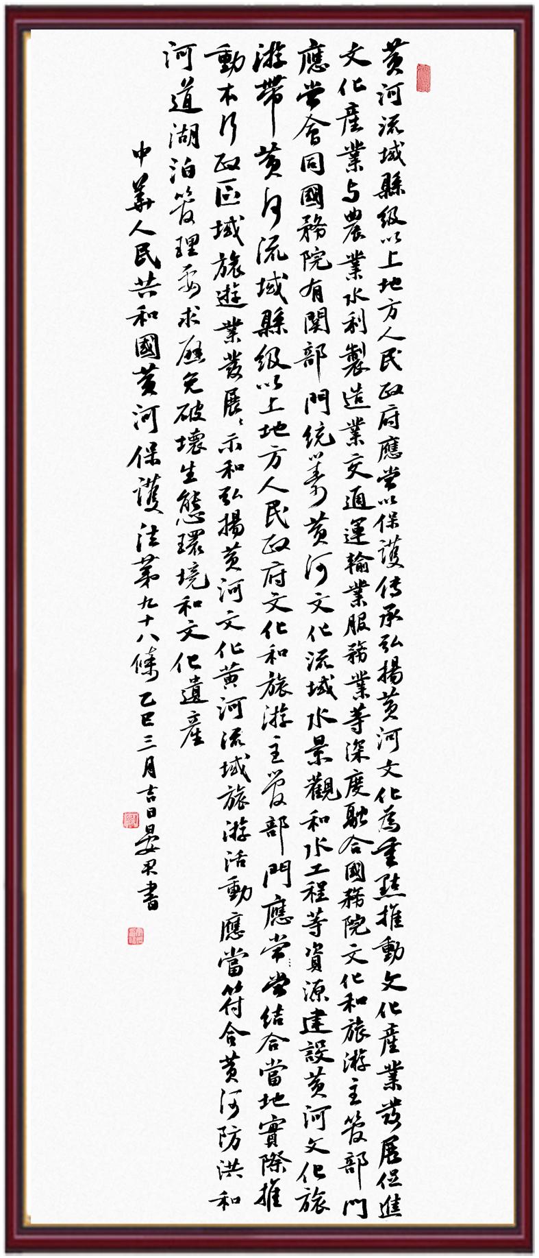 黃河寧,天下平。黃河是中華民族的發(fā)源地和搖籃,保護(hù)黃河是事關(guān)中華民族偉大復(fù)興的千秋大計(jì)。《中華人民共和國黃河保護(hù)法》為推進(jìn)水資源節(jié)約集約利用、保護(hù)傳承弘揚(yáng)黃河文化、推動(dòng)黃河流域生態(tài)保護(hù)和高質(zhì)量發(fā)展提供了有力法治保障。繼書寫《中華人民共和國民法典》《中華人民共和國憲法》《中華人民共和國澳門特別行政區(qū)基本法》《中華人民共和國香港特別行政區(qū)基本法》《中華人民共和國國旗法》《中華人民共和國國徽法》《中華人民共和國國歌法》《中華人民共和國法官法》等法律法規(guī)之后,法制日?qǐng)?bào)社聯(lián)合沿黃九?。▍^(qū))司法廳、書法家協(xié)會(huì),將筆端對(duì)準(zhǔn)《中華人民共和國黃河保護(hù)法》。