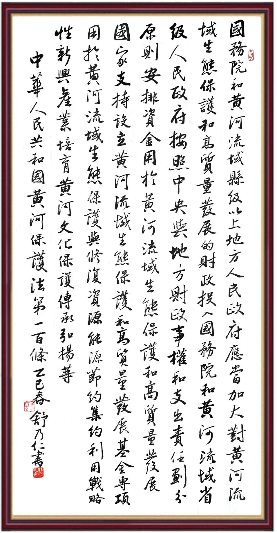 黃河寧,天下平。黃河是中華民族的發(fā)源地和搖籃,保護(hù)黃河是事關(guān)中華民族偉大復(fù)興的千秋大計?!吨腥A人民共和國黃河保護(hù)法》為推進(jìn)水資源節(jié)約集約利用、保護(hù)傳承弘揚(yáng)黃河文化、推動黃河流域生態(tài)保護(hù)和高質(zhì)量發(fā)展提供了有力法治保障。繼書寫《中華人民共和國民法典》《中華人民共和國憲法》《中華人民共和國澳門特別行政區(qū)基本法》《中華人民共和國香港特別行政區(qū)基本法》《中華人民共和國國旗法》《中華人民共和國國徽法》《中華人民共和國國歌法》《中華人民共和國法官法》等法律法規(guī)之后,法制日報社聯(lián)合沿黃九?。▍^(qū))司法廳、書法家協(xié)會,將筆端對準(zhǔn)《中華人民共和國黃河保護(hù)法》。