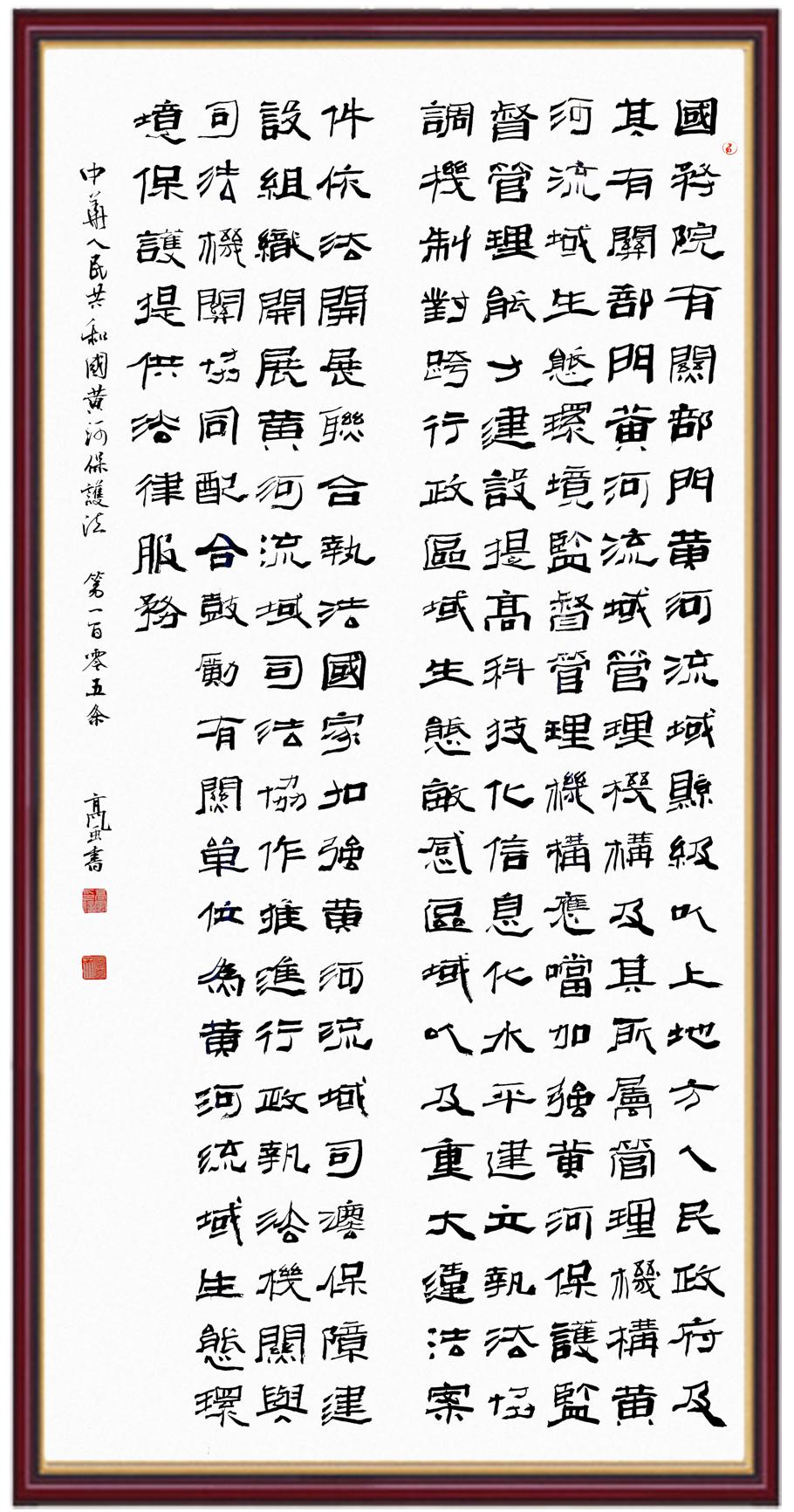 黃河寧,天下平。黃河是中華民族的發(fā)源地和搖籃,保護(hù)黃河是事關(guān)中華民族偉大復(fù)興的千秋大計(jì)?!吨腥A人民共和國黃河保護(hù)法》為推進(jìn)水資源節(jié)約集約利用、保護(hù)傳承弘揚(yáng)黃河文化、推動(dòng)黃河流域生態(tài)保護(hù)和高質(zhì)量發(fā)展提供了有力法治保障。繼書寫《中華人民共和國民法典》《中華人民共和國憲法》《中華人民共和國澳門特別行政區(qū)基本法》《中華人民共和國香港特別行政區(qū)基本法》《中華人民共和國國旗法》《中華人民共和國國徽法》《中華人民共和國國歌法》《中華人民共和國法官法》等法律法規(guī)之后,法制日?qǐng)?bào)社聯(lián)合沿黃九?。▍^(qū))司法廳、書法家協(xié)會(huì),將筆端對(duì)準(zhǔn)《中華人民共和國黃河保護(hù)法》。