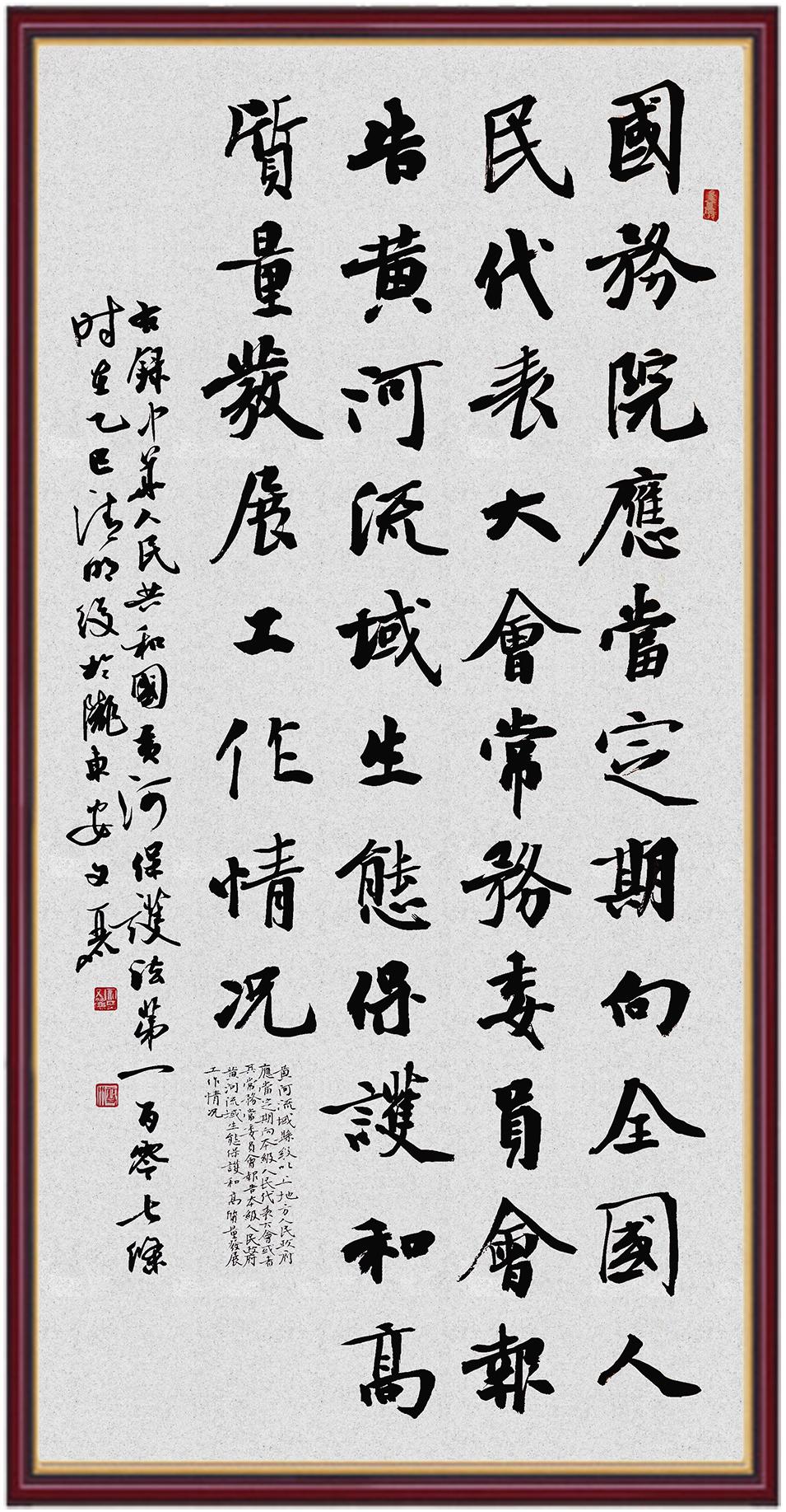 黃河寧,天下平。黃河是中華民族的發(fā)源地和搖籃,保護(hù)黃河是事關(guān)中華民族偉大復(fù)興的千秋大計(jì)。《中華人民共和國黃河保護(hù)法》為推進(jìn)水資源節(jié)約集約利用、保護(hù)傳承弘揚(yáng)黃河文化、推動(dòng)黃河流域生態(tài)保護(hù)和高質(zhì)量發(fā)展提供了有力法治保障。繼書寫《中華人民共和國民法典》《中華人民共和國憲法》《中華人民共和國澳門特別行政區(qū)基本法》《中華人民共和國香港特別行政區(qū)基本法》《中華人民共和國國旗法》《中華人民共和國國徽法》《中華人民共和國國歌法》《中華人民共和國法官法》等法律法規(guī)之后,法制日報(bào)社聯(lián)合沿黃九?。▍^(qū))司法廳、書法家協(xié)會(huì),將筆端對準(zhǔn)《中華人民共和國黃河保護(hù)法》。