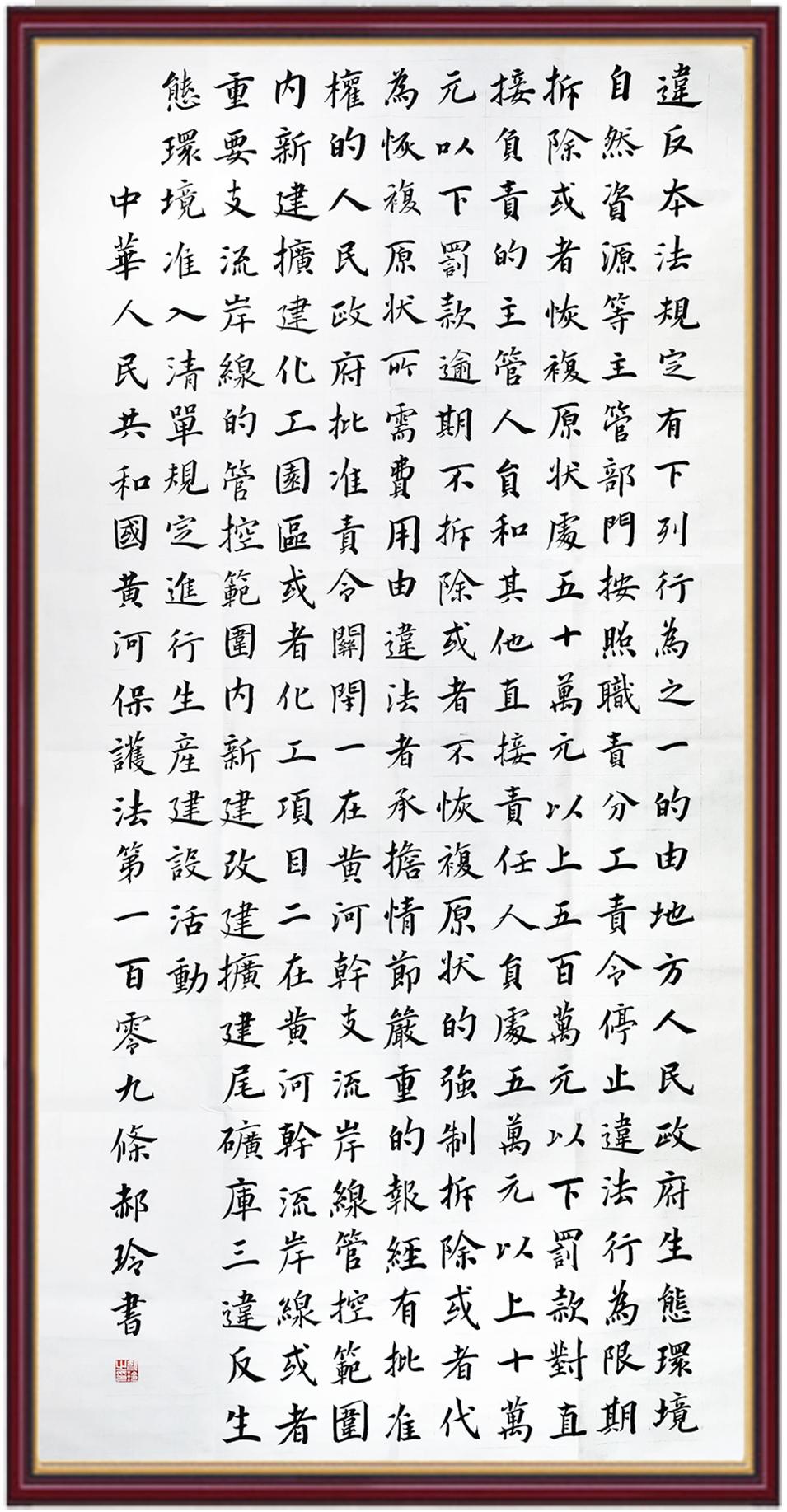 黃河寧,天下平。黃河是中華民族的發(fā)源地和搖籃,保護(hù)黃河是事關(guān)中華民族偉大復(fù)興的千秋大計(jì)。《中華人民共和國(guó)黃河保護(hù)法》為推進(jìn)水資源節(jié)約集約利用、保護(hù)傳承弘揚(yáng)黃河文化、推動(dòng)黃河流域生態(tài)保護(hù)和高質(zhì)量發(fā)展提供了有力法治保障。繼書(shū)寫(xiě)《中華人民共和國(guó)民法典》《中華人民共和國(guó)憲法》《中華人民共和國(guó)澳門(mén)特別行政區(qū)基本法》《中華人民共和國(guó)香港特別行政區(qū)基本法》《中華人民共和國(guó)國(guó)旗法》《中華人民共和國(guó)國(guó)徽法》《中華人民共和國(guó)國(guó)歌法》《中華人民共和國(guó)法官法》等法律法規(guī)之后,法制日?qǐng)?bào)社聯(lián)合沿黃九?。▍^(qū))司法廳、書(shū)法家協(xié)會(huì),將筆端對(duì)準(zhǔn)《中華人民共和國(guó)黃河保護(hù)法》。
