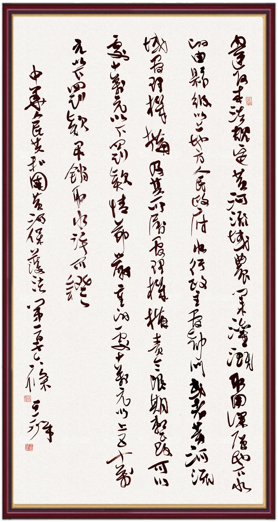 黃河寧,天下平。黃河是中華民族的發(fā)源地和搖籃,保護黃河是事關中華民族偉大復興的千秋大計?!吨腥A人民共和國黃河保護法》為推進水資源節(jié)約集約利用、保護傳承弘揚黃河文化、推動黃河流域生態(tài)保護和高質量發(fā)展提供了有力法治保障。繼書寫《中華人民共和國民法典》《中華人民共和國憲法》《中華人民共和國澳門特別行政區(qū)基本法》《中華人民共和國香港特別行政區(qū)基本法》《中華人民共和國國旗法》《中華人民共和國國徽法》《中華人民共和國國歌法》《中華人民共和國法官法》等法律法規(guī)之后,法制日報社聯(lián)合沿黃九?。▍^(qū))司法廳、書法家協(xié)會,將筆端對準《中華人民共和國黃河保護法》。