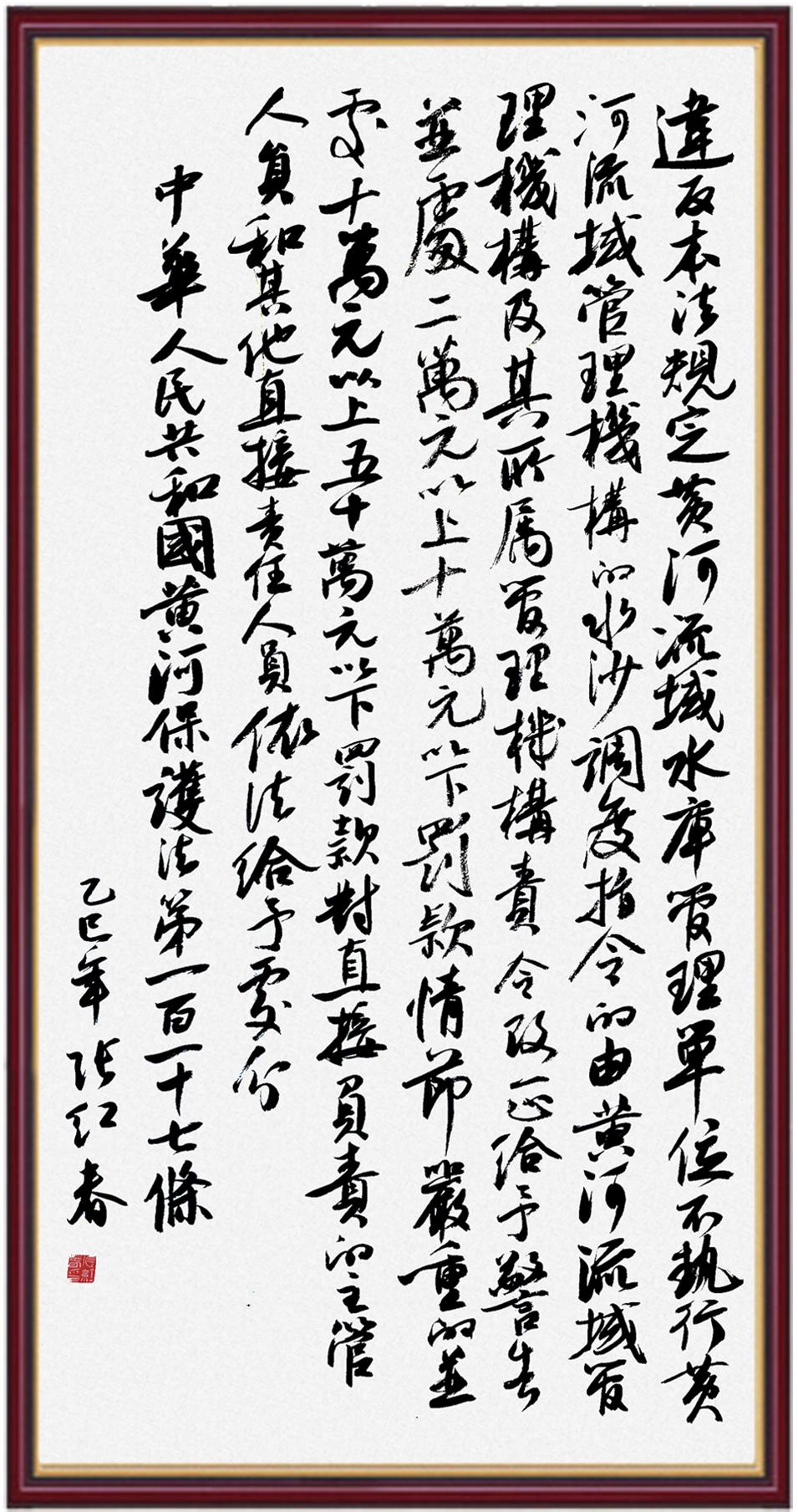 黃河寧,天下平。黃河是中華民族的發(fā)源地和搖籃,保護黃河是事關中華民族偉大復興的千秋大計。《中華人民共和國黃河保護法》為推進水資源節(jié)約集約利用、保護傳承弘揚黃河文化、推動黃河流域生態(tài)保護和高質量發(fā)展提供了有力法治保障。繼書寫《中華人民共和國民法典》《中華人民共和國憲法》《中華人民共和國澳門特別行政區(qū)基本法》《中華人民共和國香港特別行政區(qū)基本法》《中華人民共和國國旗法》《中華人民共和國國徽法》《中華人民共和國國歌法》《中華人民共和國法官法》等法律法規(guī)之后,法制日報社聯(lián)合沿黃九省(區(qū))司法廳、書法家協(xié)會,將筆端對準《中華人民共和國黃河保護法》。