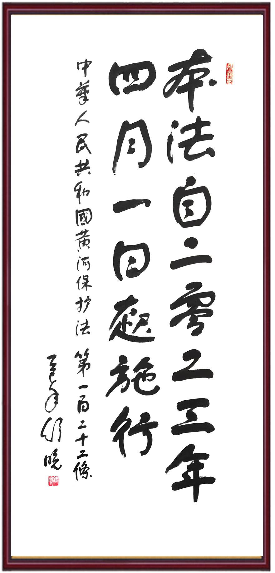 黃河寧,天下平。黃河是中華民族的發(fā)源地和搖籃,保護(hù)黃河是事關(guān)中華民族偉大復(fù)興的千秋大計?!吨腥A人民共和國黃河保護(hù)法》為推進(jìn)水資源節(jié)約集約利用、保護(hù)傳承弘揚(yáng)黃河文化、推動黃河流域生態(tài)保護(hù)和高質(zhì)量發(fā)展提供了有力法治保障。繼書寫《中華人民共和國民法典》《中華人民共和國憲法》《中華人民共和國澳門特別行政區(qū)基本法》《中華人民共和國香港特別行政區(qū)基本法》《中華人民共和國國旗法》《中華人民共和國國徽法》《中華人民共和國國歌法》《中華人民共和國法官法》等法律法規(guī)之后,法制日報社聯(lián)合沿黃九?。▍^(qū))司法廳、書法家協(xié)會,將筆端對準(zhǔn)《中華人民共和國黃河保護(hù)法》。