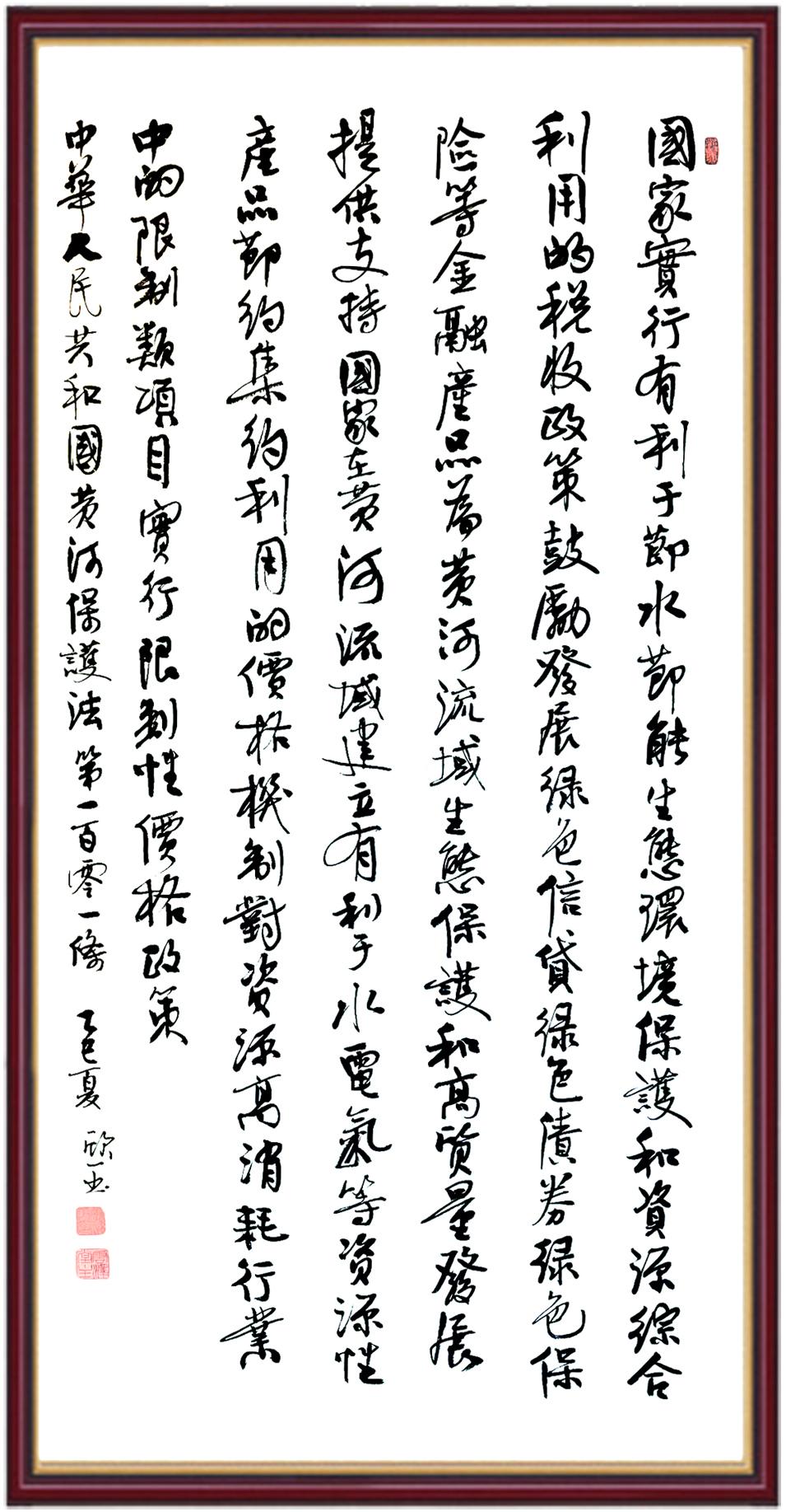 黃河寧,天下平。黃河是中華民族的發(fā)源地和搖籃,保護黃河是事關中華民族偉大復興的千秋大計?!吨腥A人民共和國黃河保護法》為推進水資源節(jié)約集約利用、保護傳承弘揚黃河文化、推動黃河流域生態(tài)保護和高質量發(fā)展提供了有力法治保障。繼書寫《中華人民共和國民法典》《中華人民共和國憲法》《中華人民共和國澳門特別行政區(qū)基本法》《中華人民共和國香港特別行政區(qū)基本法》《中華人民共和國國旗法》《中華人民共和國國徽法》《中華人民共和國國歌法》《中華人民共和國法官法》等法律法規(guī)之后,法制日報社聯(lián)合沿黃九?。▍^(qū))司法廳、書法家協(xié)會,將筆端對準《中華人民共和國黃河保護法》。