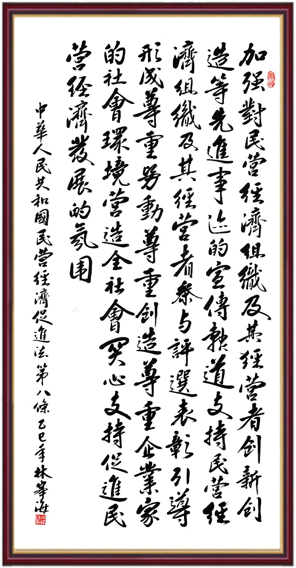 《中華人民共和國民營經(jīng)濟促進法》自今年5月20日起施行。作為我國首部專門關于民營經(jīng)濟發(fā)展的基礎性法律,民營經(jīng)濟促進法將支持和保障民營經(jīng)濟發(fā)展的法律制度融入中國特色社會主義法律體系,具有重大的法治意義,為促進民營經(jīng)濟持續(xù)、健康、高質量發(fā)展提供了堅實的法治保障。為更好地學習、宣傳、貫徹這部法律,法治日報社聯(lián)合司法部普法與依法治理局,開展“‘書·法’系列活動之書寫《中華人民共和國民營經(jīng)濟促進法》”活動。