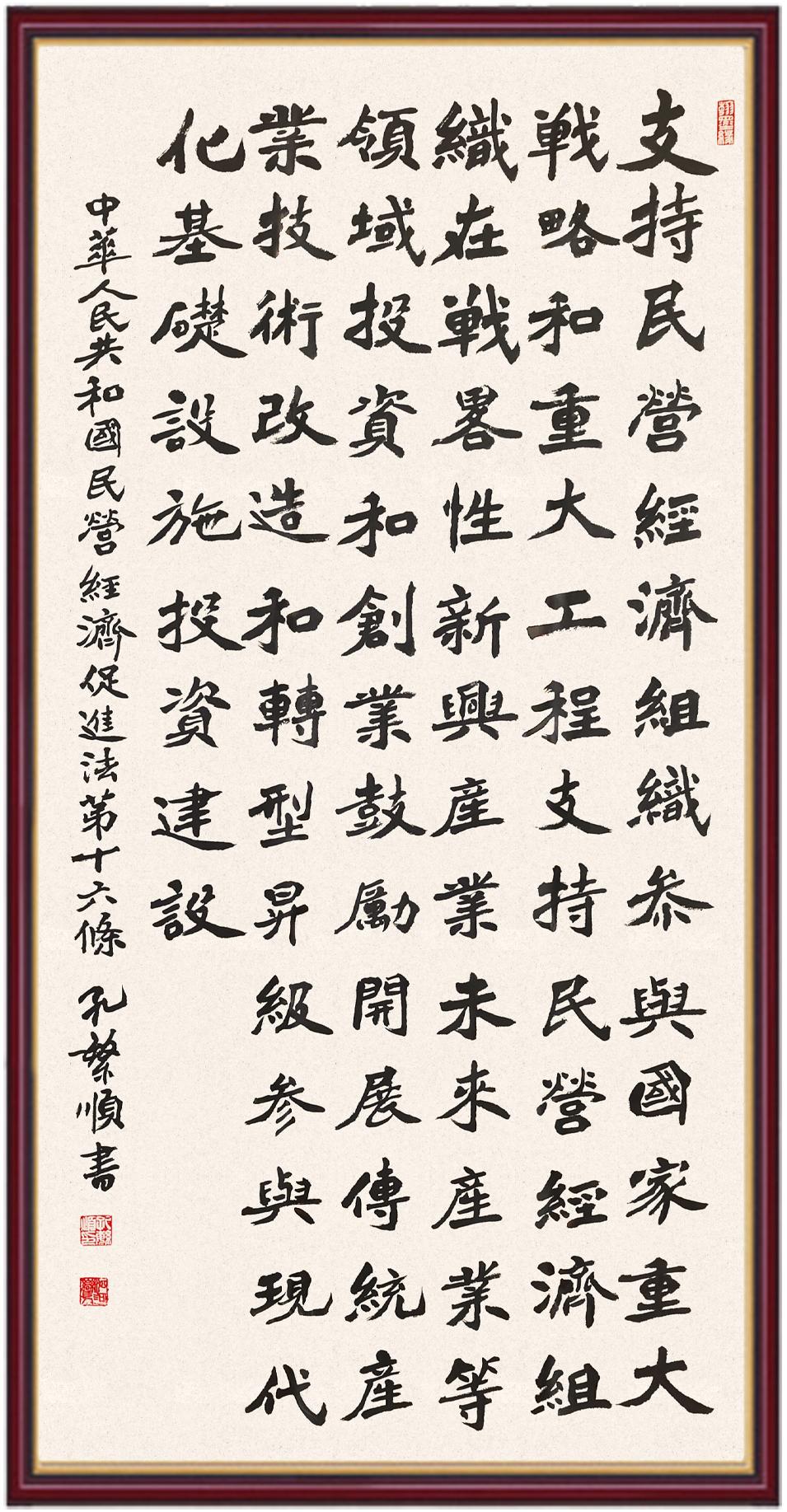 《中華人民共和國(guó)民營(yíng)經(jīng)濟(jì)促進(jìn)法》自今年5月20日起施行。作為我國(guó)首部專門關(guān)于民營(yíng)經(jīng)濟(jì)發(fā)展的基礎(chǔ)性法律,民營(yíng)經(jīng)濟(jì)促進(jìn)法將支持和保障民營(yíng)經(jīng)濟(jì)發(fā)展的法律制度融入中國(guó)特色社會(huì)主義法律體系,具有重大的法治意義,為促進(jìn)民營(yíng)經(jīng)濟(jì)持續(xù)、健康、高質(zhì)量發(fā)展提供了堅(jiān)實(shí)的法治保障。為更好地學(xué)習(xí)、宣傳、貫徹這部法律,法治日?qǐng)?bào)社聯(lián)合司法部普法與依法治理局,開展“‘書·法’系列活動(dòng)之書寫《中華人民共和國(guó)民營(yíng)經(jīng)濟(jì)促進(jìn)法》”活動(dòng)。
