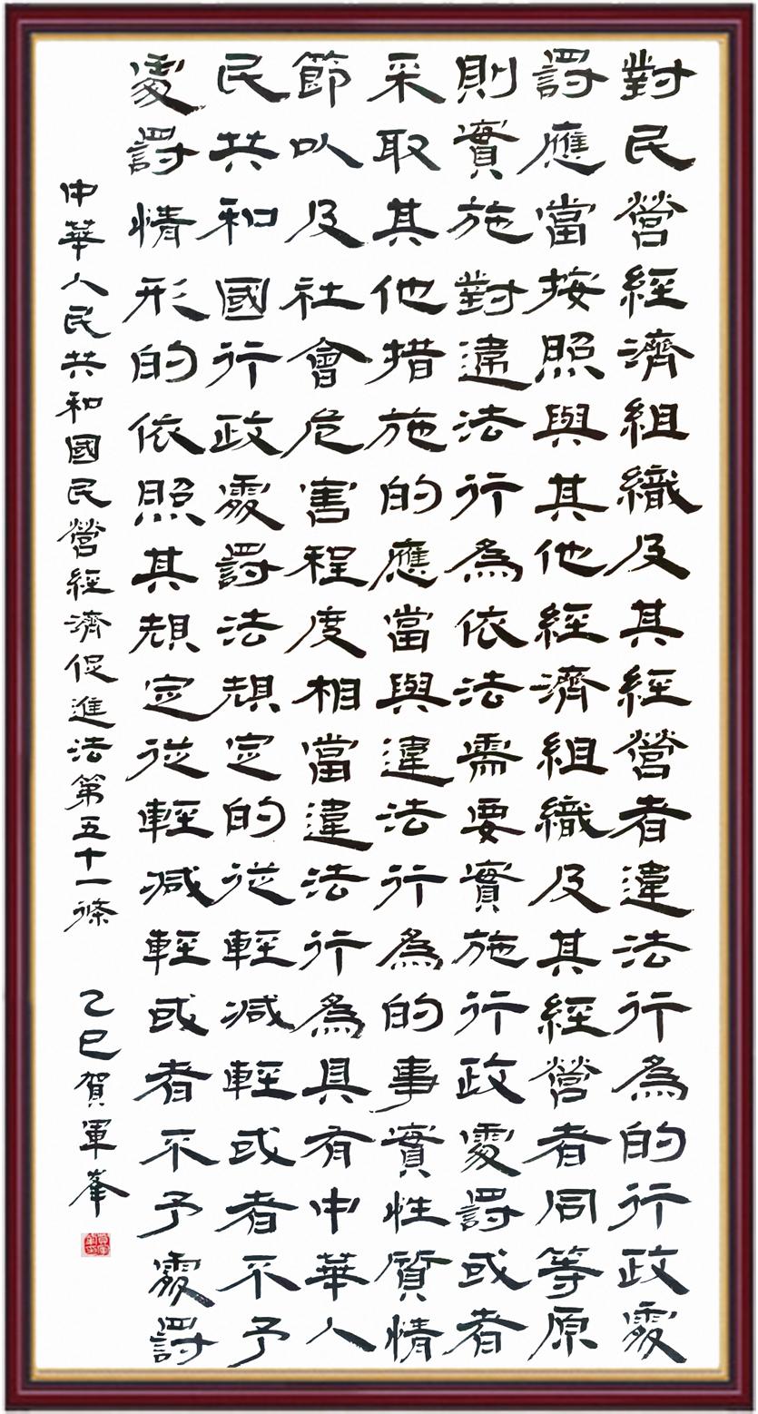 《中華人民共和國民營經(jīng)濟(jì)促進(jìn)法》自今年5月20日起施行。作為我國首部專門關(guān)于民營經(jīng)濟(jì)發(fā)展的基礎(chǔ)性法律,民營經(jīng)濟(jì)促進(jìn)法將支持和保障民營經(jīng)濟(jì)發(fā)展的法律制度融入中國特色社會(huì)主義法律體系,具有重大的法治意義,為促進(jìn)民營經(jīng)濟(jì)持續(xù)、健康、高質(zhì)量發(fā)展提供了堅(jiān)實(shí)的法治保障。為更好地學(xué)習(xí)、宣傳、貫徹這部法律,法治日?qǐng)?bào)社聯(lián)合司法部普法與依法治理局,開展“‘書·法’系列活動(dòng)之書寫《中華人民共和國民營經(jīng)濟(jì)促進(jìn)法》”活動(dòng)。