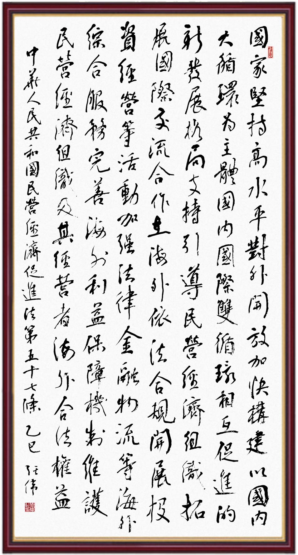 《中華人民共和國(guó)民營(yíng)經(jīng)濟(jì)促進(jìn)法》自今年5月20日起施行。作為我國(guó)首部專門關(guān)于民營(yíng)經(jīng)濟(jì)發(fā)展的基礎(chǔ)性法律,民營(yíng)經(jīng)濟(jì)促進(jìn)法將支持和保障民營(yíng)經(jīng)濟(jì)發(fā)展的法律制度融入中國(guó)特色社會(huì)主義法律體系,具有重大的法治意義,為促進(jìn)民營(yíng)經(jīng)濟(jì)持續(xù)、健康、高質(zhì)量發(fā)展提供了堅(jiān)實(shí)的法治保障。為更好地學(xué)習(xí)、宣傳、貫徹這部法律,法治日?qǐng)?bào)社聯(lián)合司法部普法與依法治理局,開展“‘書·法’系列活動(dòng)之書寫《中華人民共和國(guó)民營(yíng)經(jīng)濟(jì)促進(jìn)法》”活動(dòng)。