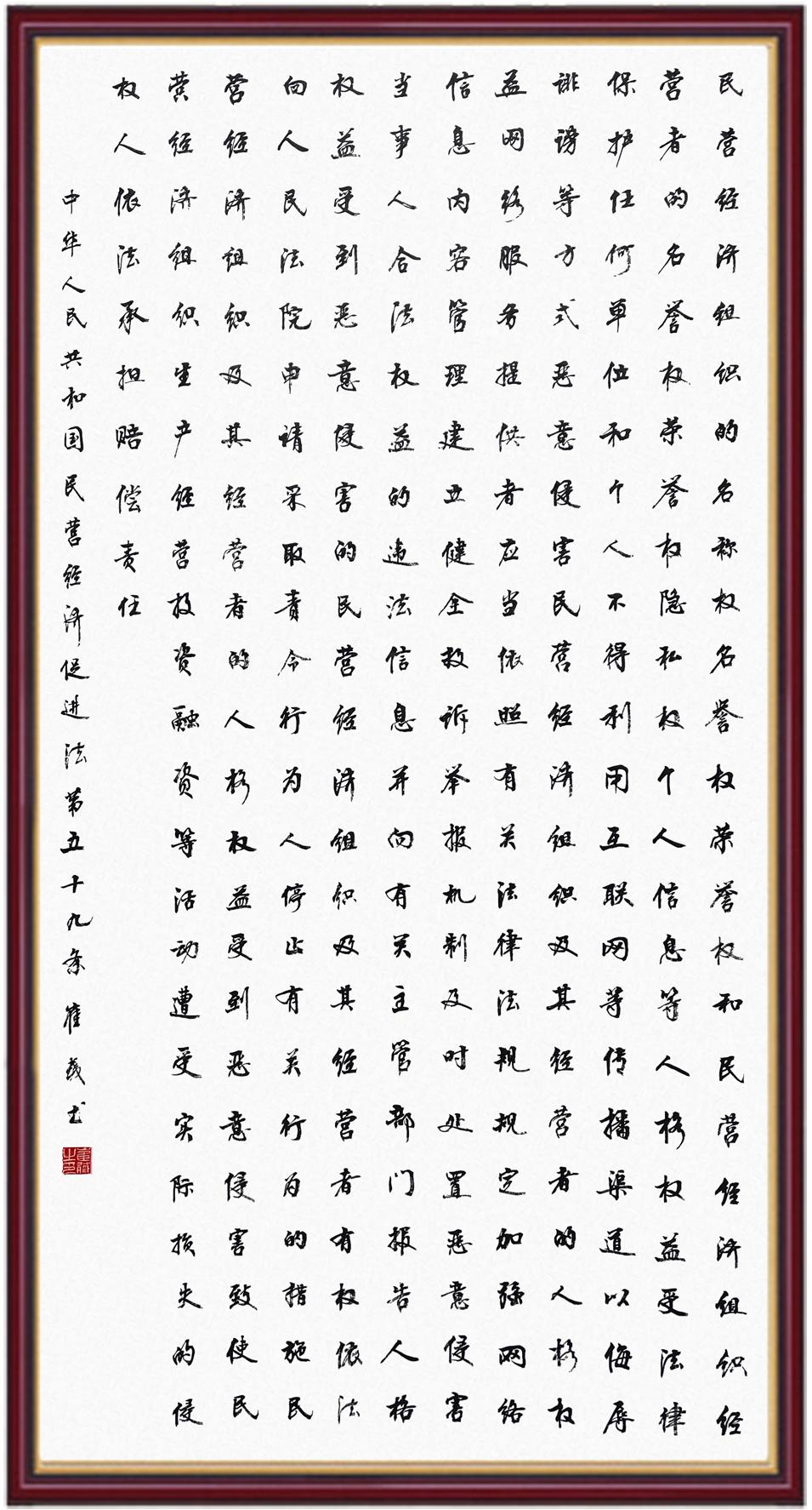 《中華人民共和國(guó)民營(yíng)經(jīng)濟(jì)促進(jìn)法》自今年5月20日起施行。作為我國(guó)首部專門(mén)關(guān)于民營(yíng)經(jīng)濟(jì)發(fā)展的基礎(chǔ)性法律,民營(yíng)經(jīng)濟(jì)促進(jìn)法將支持和保障民營(yíng)經(jīng)濟(jì)發(fā)展的法律制度融入中國(guó)特色社會(huì)主義法律體系,具有重大的法治意義,為促進(jìn)民營(yíng)經(jīng)濟(jì)持續(xù)、健康、高質(zhì)量發(fā)展提供了堅(jiān)實(shí)的法治保障。為更好地學(xué)習(xí)、宣傳、貫徹這部法律,法治日?qǐng)?bào)社聯(lián)合司法部普法與依法治理局,開(kāi)展“‘書(shū)·法’系列活動(dòng)之書(shū)寫(xiě)《中華人民共和國(guó)民營(yíng)經(jīng)濟(jì)促進(jìn)法》”活動(dòng)。