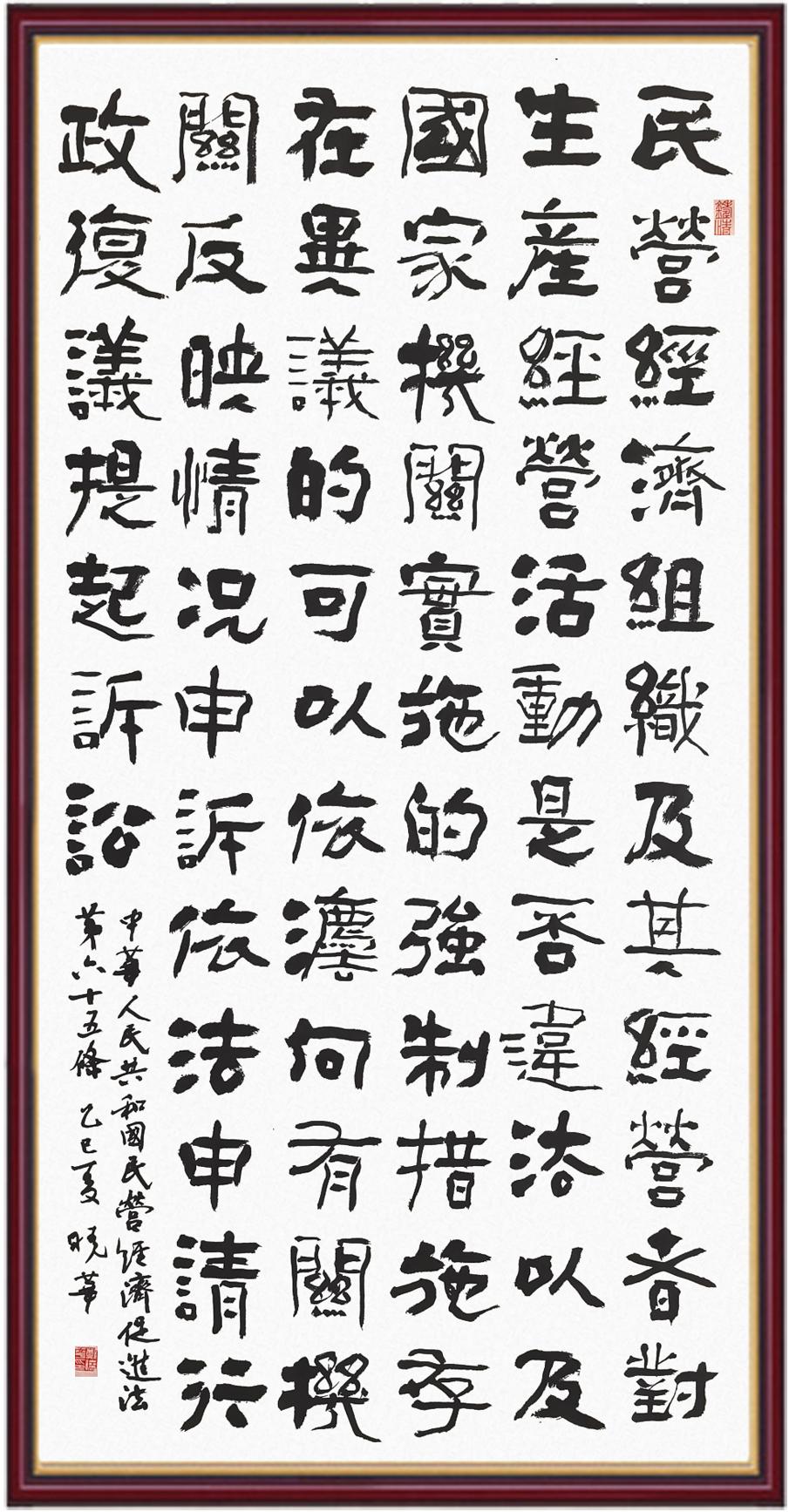 《中華人民共和國(guó)民營(yíng)經(jīng)濟(jì)促進(jìn)法》自今年5月20日起施行。作為我國(guó)首部專門關(guān)于民營(yíng)經(jīng)濟(jì)發(fā)展的基礎(chǔ)性法律,民營(yíng)經(jīng)濟(jì)促進(jìn)法將支持和保障民營(yíng)經(jīng)濟(jì)發(fā)展的法律制度融入中國(guó)特色社會(huì)主義法律體系,具有重大的法治意義,為促進(jìn)民營(yíng)經(jīng)濟(jì)持續(xù)、健康、高質(zhì)量發(fā)展提供了堅(jiān)實(shí)的法治保障。為更好地學(xué)習(xí)、宣傳、貫徹這部法律,法治日?qǐng)?bào)社聯(lián)合司法部普法與依法治理局,開展“‘書·法’系列活動(dòng)之書寫《中華人民共和國(guó)民營(yíng)經(jīng)濟(jì)促進(jìn)法》”活動(dòng)。