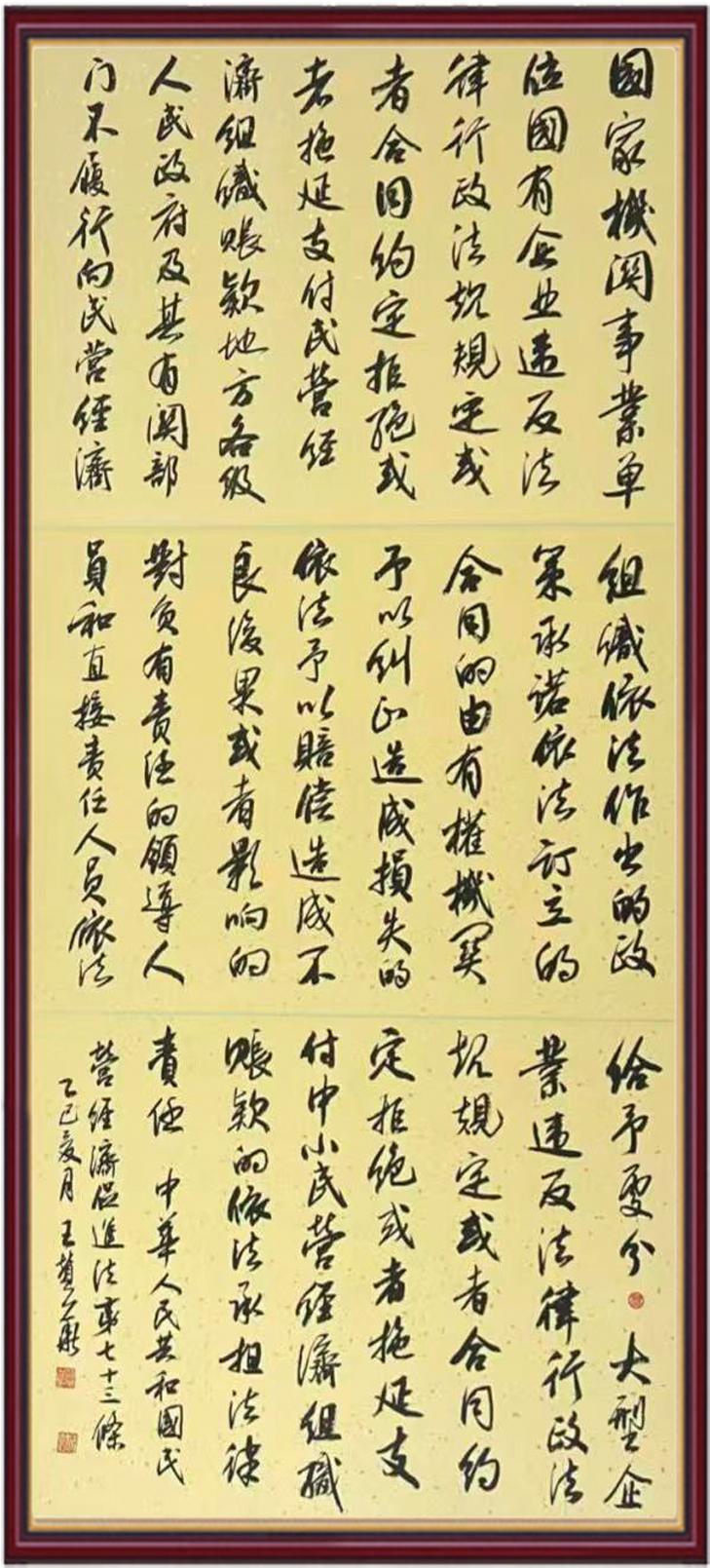 2020年7月11日,由法治日報社主辦、法報文化傳媒(北京)有限公司和北京千音文化傳媒有限公司聯(lián)合承辦的“書·法”系列活動正式啟動?!皶しā被顒又荚跒閯?chuàng)新法治宣傳教育,多開一點腦洞、多花一點心思、多出一點力量、多作一點貢獻,引領和推動更多的人拿起筆來學法、寫法,在不斷“書·法”過程中,提升自身的法治素養(yǎng),在全社會弘揚法治精神。先后書寫《中華人民共和國民法典》《中華人民共和國憲法》《中華人民共和國澳門特別行政區(qū)基本法》《中華人民共和國香港特別行政區(qū)基本法》《中華人民共和國國旗法》《中華人民共和國國徽法》《中華人民共和國國歌法》《中華人民共和國法官法》《中華人民共和國黃河保護法》等19部法律法規(guī)。
