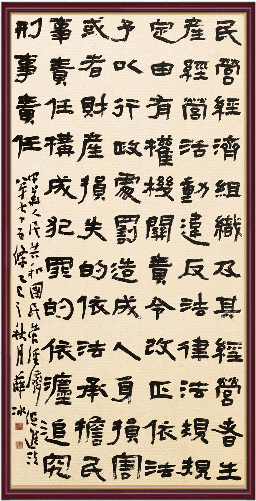 2020年7月11日,由法治日報社主辦、法報文化傳媒(北京)有限公司和北京千音文化傳媒有限公司聯(lián)合承辦的“書·法”系列活動正式啟動?!皶しā被顒又荚跒閯?chuàng)新法治宣傳教育,多開一點腦洞、多花一點心思、多出一點力量、多作一點貢獻,引領(lǐng)和推動更多的人拿起筆來學法、寫法,在不斷“書·法”過程中,提升自身的法治素養(yǎng),在全社會弘揚法治精神。先后書寫《中華人民共和國民法典》《中華人民共和國憲法》《中華人民共和國澳門特別行政區(qū)基本法》《中華人民共和國香港特別行政區(qū)基本法》《中華人民共和國國旗法》《中華人民共和國國徽法》《中華人民共和國國歌法》《中華人民共和國法官法》《中華人民共和國黃河保護法》等19部法律法規(guī)。