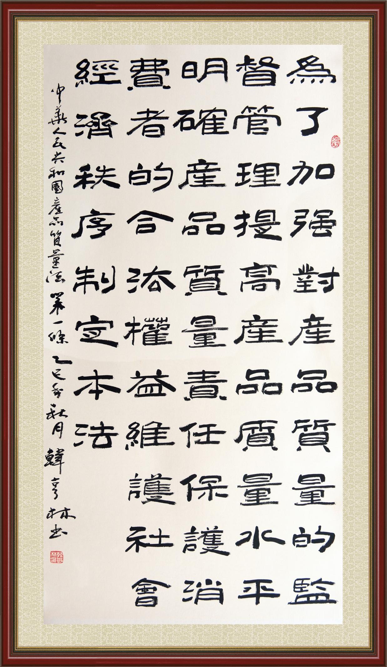 《中華人民共和國(guó)產(chǎn)品質(zhì)量法》自1993年9月1日起開(kāi)始施行,先后進(jìn)行三次修正。作為產(chǎn)品質(zhì)量領(lǐng)域的基本法律,產(chǎn)品質(zhì)量法對(duì)規(guī)范產(chǎn)品質(zhì)量管理、維護(hù)消費(fèi)者合法權(quán)益、促進(jìn)經(jīng)濟(jì)社會(huì)發(fā)展具有重要意義。為更好地學(xué)習(xí)、宣傳、貫徹這部法律,在國(guó)家市場(chǎng)監(jiān)督管理總局法規(guī)司的支持下,法治日?qǐng)?bào)社開(kāi)展了“‘書(shū)·法’系列活動(dòng)之書(shū)寫《中華人民共和國(guó)產(chǎn)品質(zhì)量法》”活動(dòng)。