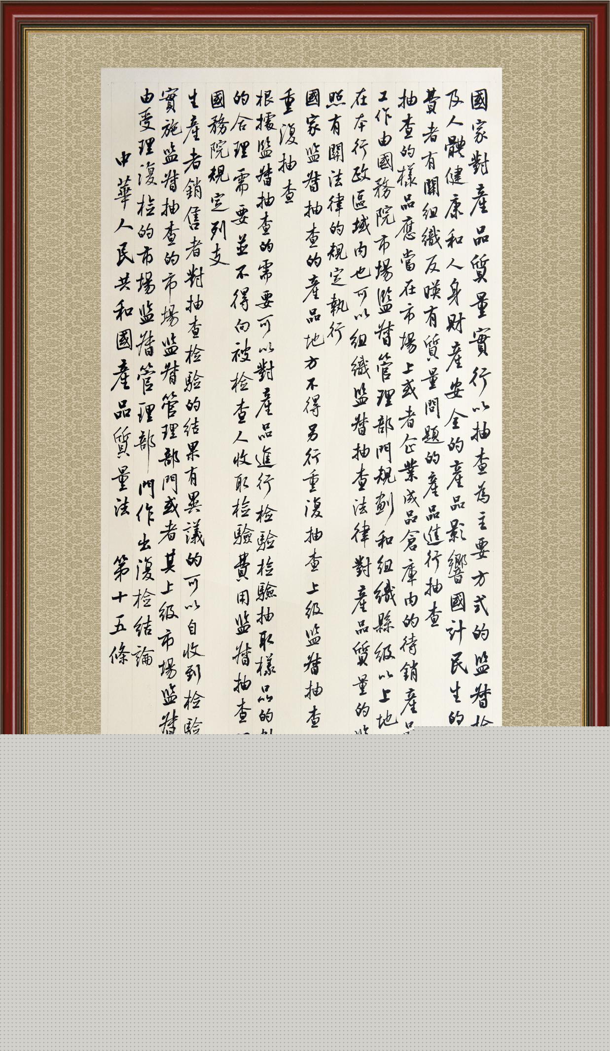 《中華人民共和國產(chǎn)品質(zhì)量法》自1993年9月1日起開始施行,先后進行三次修正。作為產(chǎn)品質(zhì)量領(lǐng)域的基本法律,產(chǎn)品質(zhì)量法對規(guī)范產(chǎn)品質(zhì)量管理、維護消費者合法權(quán)益、促進經(jīng)濟社會發(fā)展具有重要意義。為更好地學(xué)習(xí)、宣傳、貫徹這部法律,在國家市場監(jiān)督管理總局法規(guī)司的支持下,法治日報社開展了“‘書·法’系列活動之書寫《中華人民共和國產(chǎn)品質(zhì)量法》”活動。