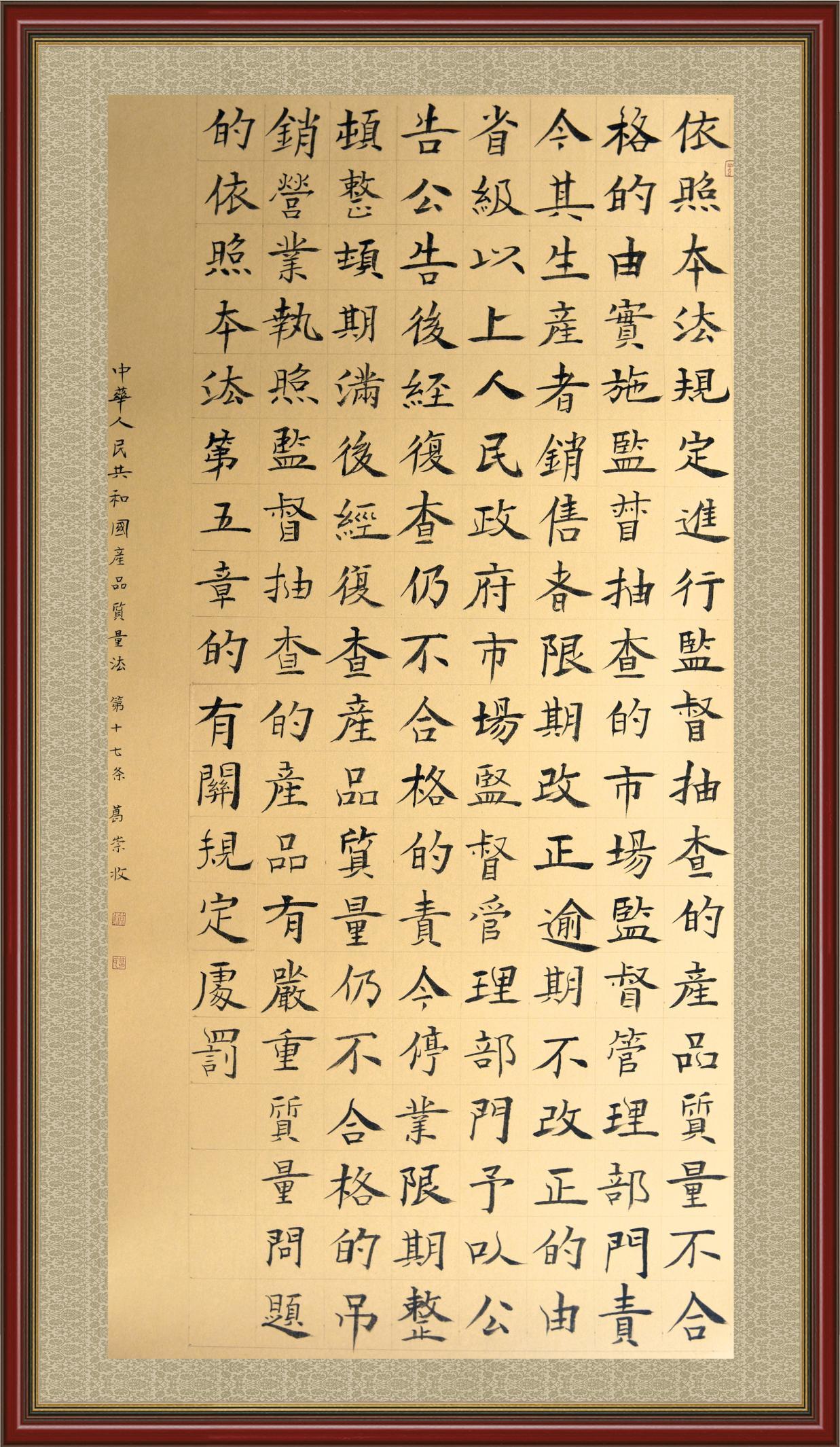 《中華人民共和國產(chǎn)品質(zhì)量法》自1993年9月1日起開始施行,先后進(jìn)行三次修正。作為產(chǎn)品質(zhì)量領(lǐng)域的基本法律,產(chǎn)品質(zhì)量法對(duì)規(guī)范產(chǎn)品質(zhì)量管理、維護(hù)消費(fèi)者合法權(quán)益、促進(jìn)經(jīng)濟(jì)社會(huì)發(fā)展具有重要意義。為更好地學(xué)習(xí)、宣傳、貫徹這部法律,在國家市場監(jiān)督管理總局法規(guī)司的支持下,法治日?qǐng)?bào)社開展了“‘書·法’系列活動(dòng)之書寫《中華人民共和國產(chǎn)品質(zhì)量法》”活動(dòng)。