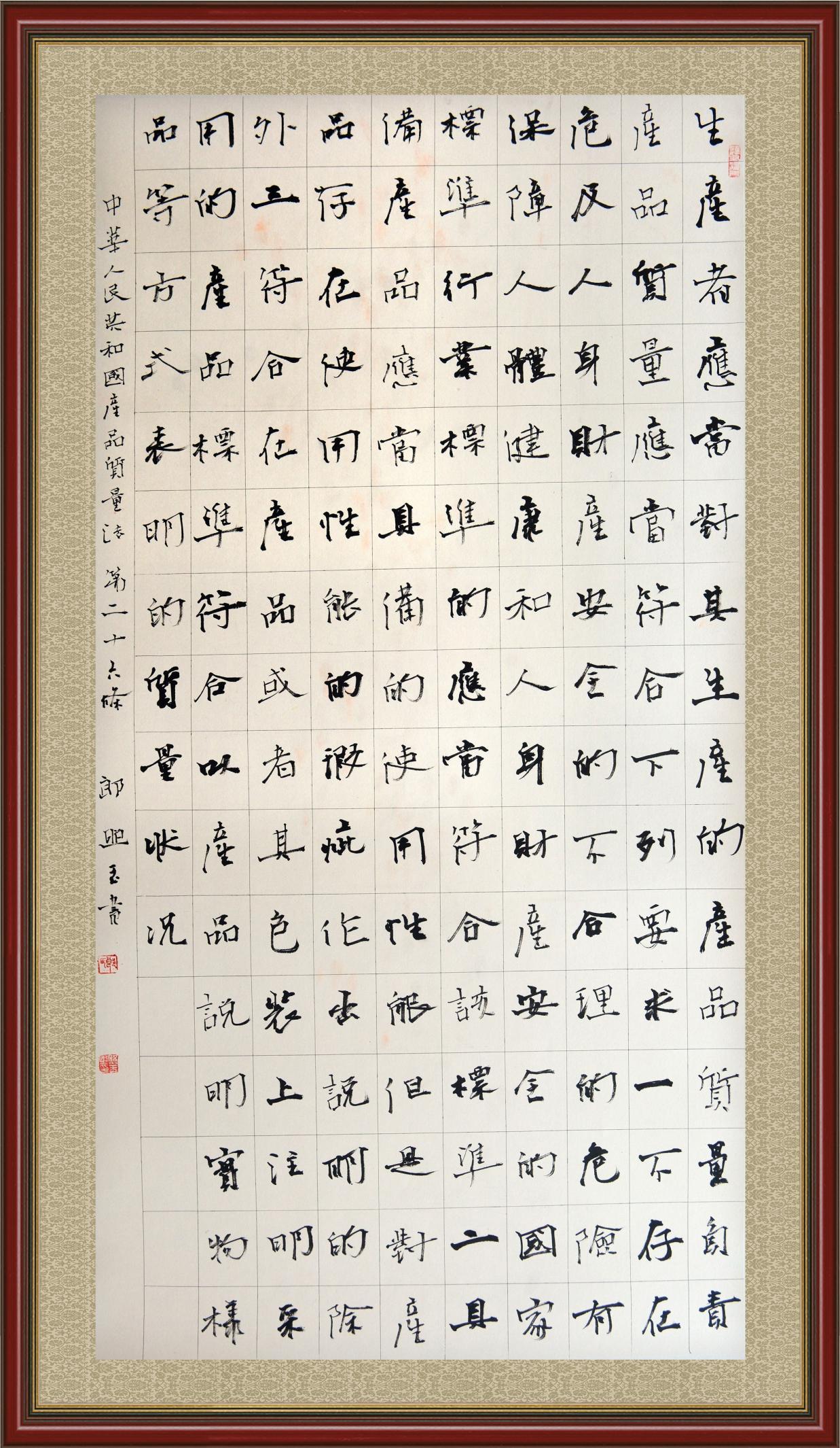 《中華人民共和國產(chǎn)品質(zhì)量法》自1993年9月1日起開始施行,先后進(jìn)行三次修正。作為產(chǎn)品質(zhì)量領(lǐng)域的基本法律,產(chǎn)品質(zhì)量法對規(guī)范產(chǎn)品質(zhì)量管理、維護(hù)消費(fèi)者合法權(quán)益、促進(jìn)經(jīng)濟(jì)社會發(fā)展具有重要意義。為更好地學(xué)習(xí)、宣傳、貫徹這部法律,在國家市場監(jiān)督管理總局法規(guī)司的支持下,法治日報社開展了“‘書·法’系列活動之書寫《中華人民共和國產(chǎn)品質(zhì)量法》”活動。