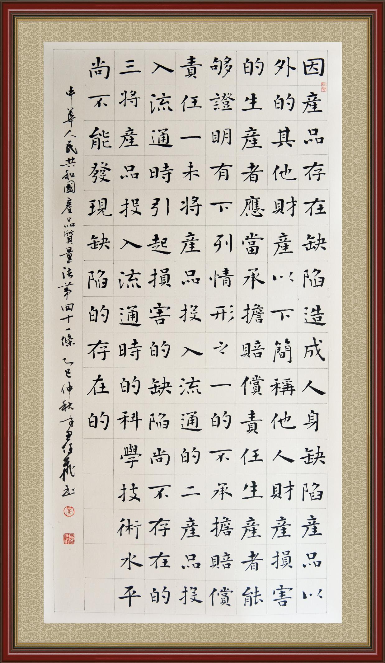 《中華人民共和國產(chǎn)品質(zhì)量法》自1993年9月1日起開始施行,先后進(jìn)行三次修正。作為產(chǎn)品質(zhì)量領(lǐng)域的基本法律,產(chǎn)品質(zhì)量法對規(guī)范產(chǎn)品質(zhì)量管理、維護(hù)消費(fèi)者合法權(quán)益、促進(jìn)經(jīng)濟(jì)社會發(fā)展具有重要意義。為更好地學(xué)習(xí)、宣傳、貫徹這部法律,在國家市場監(jiān)督管理總局法規(guī)司的支持下,法治日報社開展了“‘書·法’系列活動之書寫《中華人民共和國產(chǎn)品質(zhì)量法》”活動。