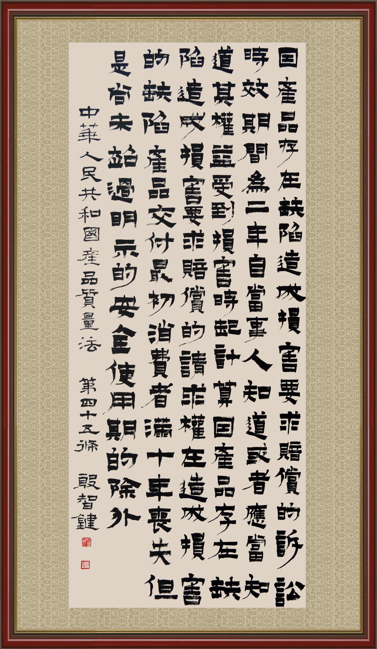 《中華人民共和國產(chǎn)品質(zhì)量法》自1993年9月1日起開始施行,先后進行三次修正。作為產(chǎn)品質(zhì)量領(lǐng)域的基本法律,產(chǎn)品質(zhì)量法對規(guī)范產(chǎn)品質(zhì)量管理、維護消費者合法權(quán)益、促進經(jīng)濟社會發(fā)展具有重要意義。為更好地學(xué)習(xí)、宣傳、貫徹這部法律,在國家市場監(jiān)督管理總局法規(guī)司的支持下,法治日報社開展了“‘書·法’系列活動之書寫《中華人民共和國產(chǎn)品質(zhì)量法》”活動。