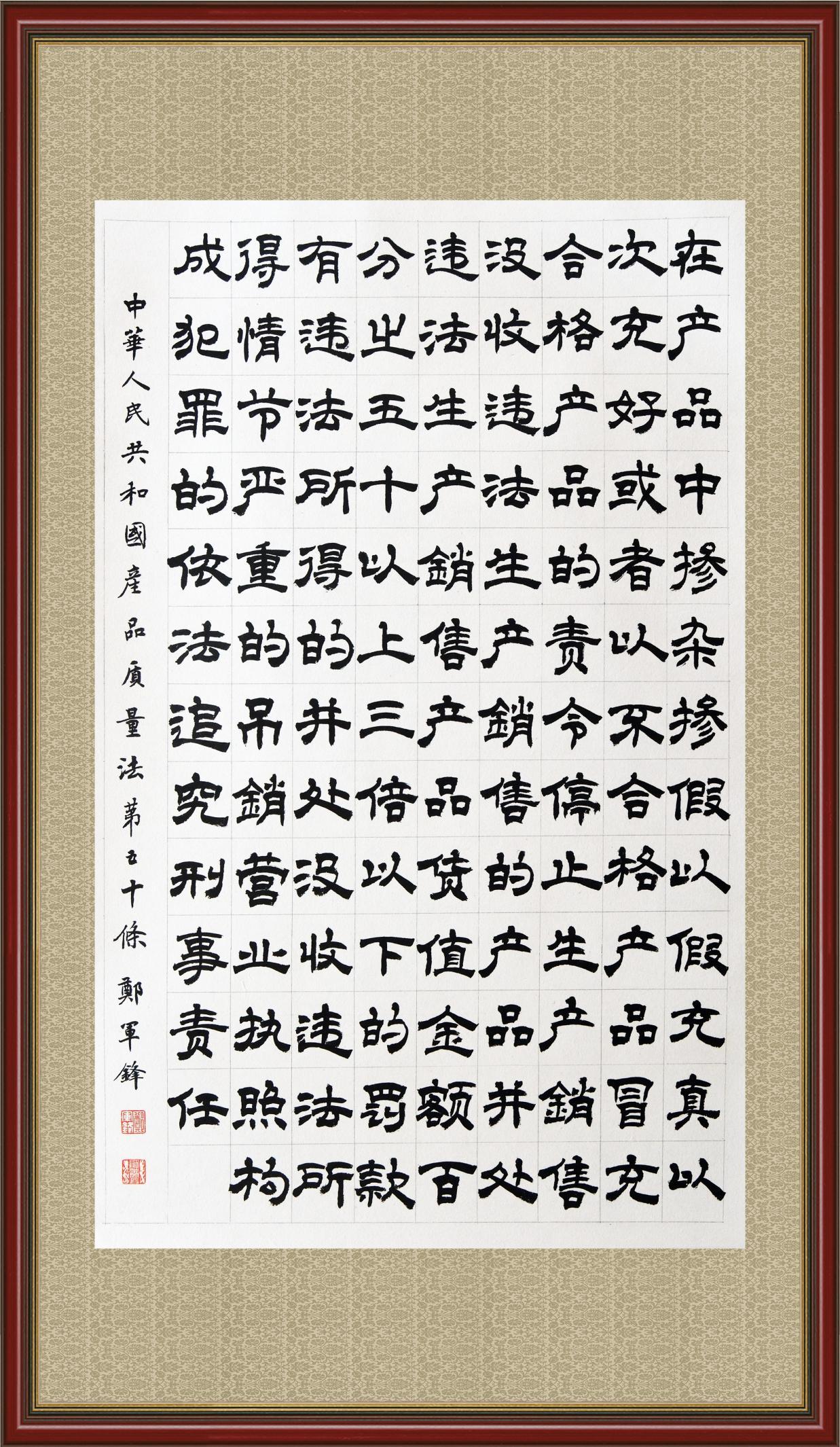 《中華人民共和國產(chǎn)品質(zhì)量法》自1993年9月1日起開始施行,先后進(jìn)行三次修正。作為產(chǎn)品質(zhì)量領(lǐng)域的基本法律,產(chǎn)品質(zhì)量法對規(guī)范產(chǎn)品質(zhì)量管理、維護(hù)消費者合法權(quán)益、促進(jìn)經(jīng)濟(jì)社會發(fā)展具有重要意義。為更好地學(xué)習(xí)、宣傳、貫徹這部法律,在國家市場監(jiān)督管理總局法規(guī)司的支持下,法治日報社開展了“‘書·法’系列活動之書寫《中華人民共和國產(chǎn)品質(zhì)量法》”活動。