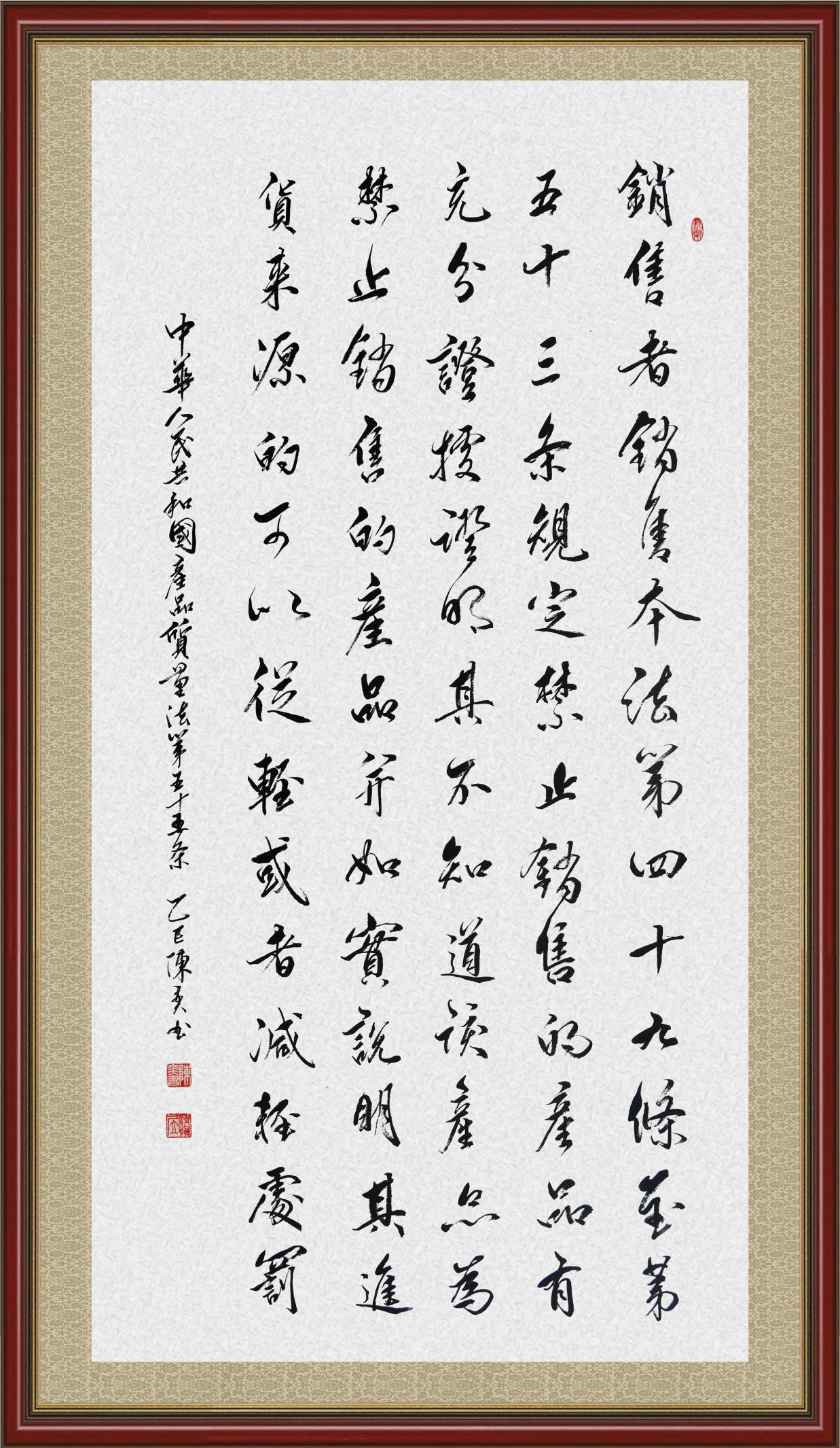 《中華人民共和國產(chǎn)品質量法》自1993年9月1日起開始施行,先后進行三次修正。作為產(chǎn)品質量領域的基本法律,產(chǎn)品質量法對規(guī)范產(chǎn)品質量管理、維護消費者合法權益、促進經(jīng)濟社會發(fā)展具有重要意義。為更好地學習、宣傳、貫徹這部法律,在國家市場監(jiān)督管理總局法規(guī)司的支持下,法治日報社開展了“‘書·法’系列活動之書寫《中華人民共和國產(chǎn)品質量法》”活動。