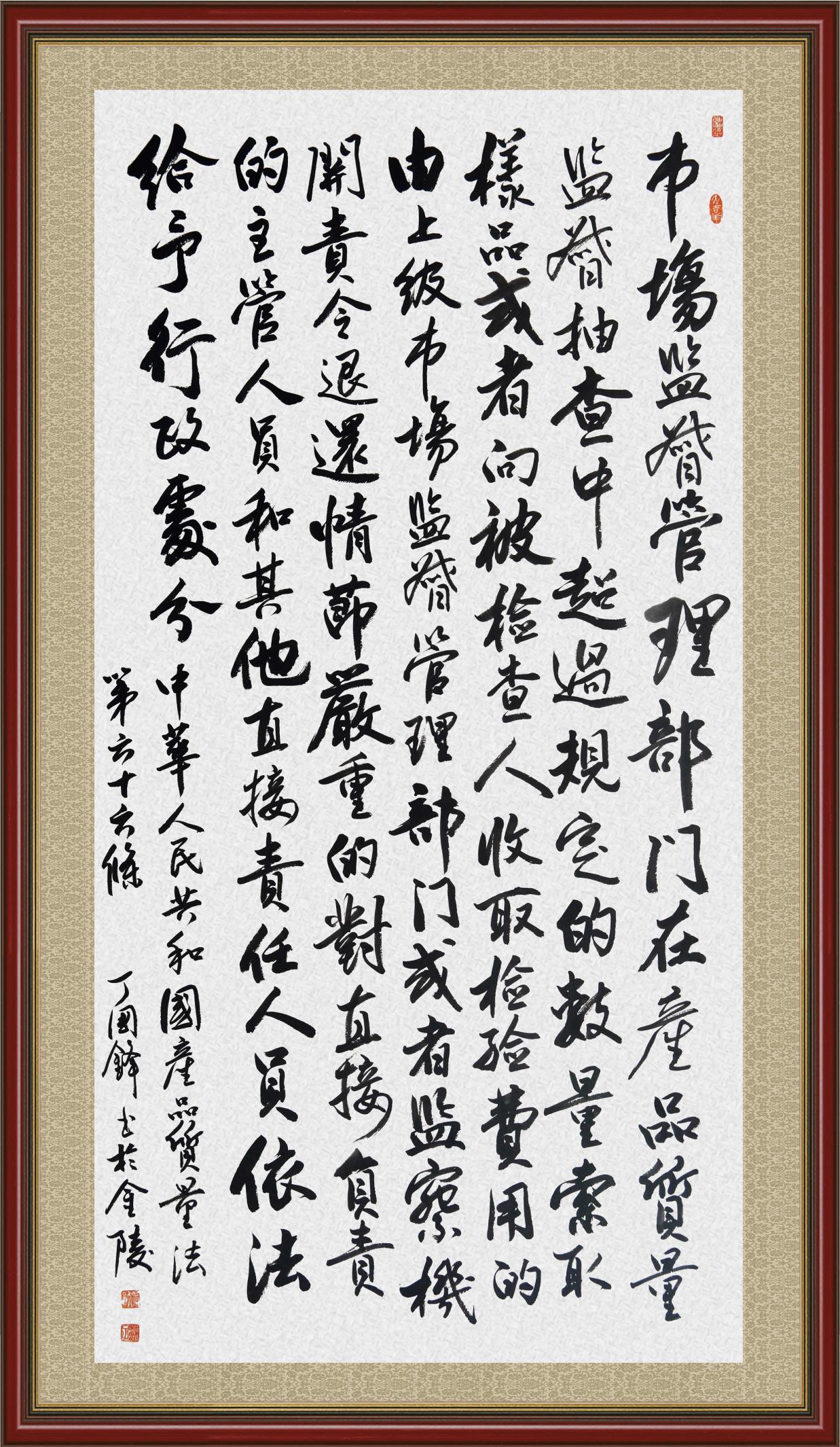 《中華人民共和國(guó)產(chǎn)品質(zhì)量法》自1993年9月1日起開(kāi)始施行,先后進(jìn)行三次修正。作為產(chǎn)品質(zhì)量領(lǐng)域的基本法律,產(chǎn)品質(zhì)量法對(duì)規(guī)范產(chǎn)品質(zhì)量管理、維護(hù)消費(fèi)者合法權(quán)益、促進(jìn)經(jīng)濟(jì)社會(huì)發(fā)展具有重要意義。為更好地學(xué)習(xí)、宣傳、貫徹這部法律,在國(guó)家市場(chǎng)監(jiān)督管理總局法規(guī)司的支持下,法治日?qǐng)?bào)社開(kāi)展了“‘書(shū)·法’系列活動(dòng)之書(shū)寫(xiě)《中華人民共和國(guó)產(chǎn)品質(zhì)量法》”活動(dòng)。