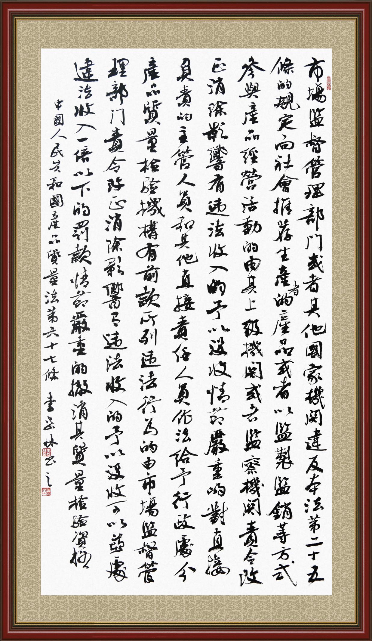 《中華人民共和國(guó)產(chǎn)品質(zhì)量法》自1993年9月1日起開(kāi)始施行,先后進(jìn)行三次修正。作為產(chǎn)品質(zhì)量領(lǐng)域的基本法律,產(chǎn)品質(zhì)量法對(duì)規(guī)范產(chǎn)品質(zhì)量管理、維護(hù)消費(fèi)者合法權(quán)益、促進(jìn)經(jīng)濟(jì)社會(huì)發(fā)展具有重要意義。為更好地學(xué)習(xí)、宣傳、貫徹這部法律,在國(guó)家市場(chǎng)監(jiān)督管理總局法規(guī)司的支持下,法治日?qǐng)?bào)社開(kāi)展了“‘書(shū)·法’系列活動(dòng)之書(shū)寫(xiě)《中華人民共和國(guó)產(chǎn)品質(zhì)量法》”活動(dòng)。
