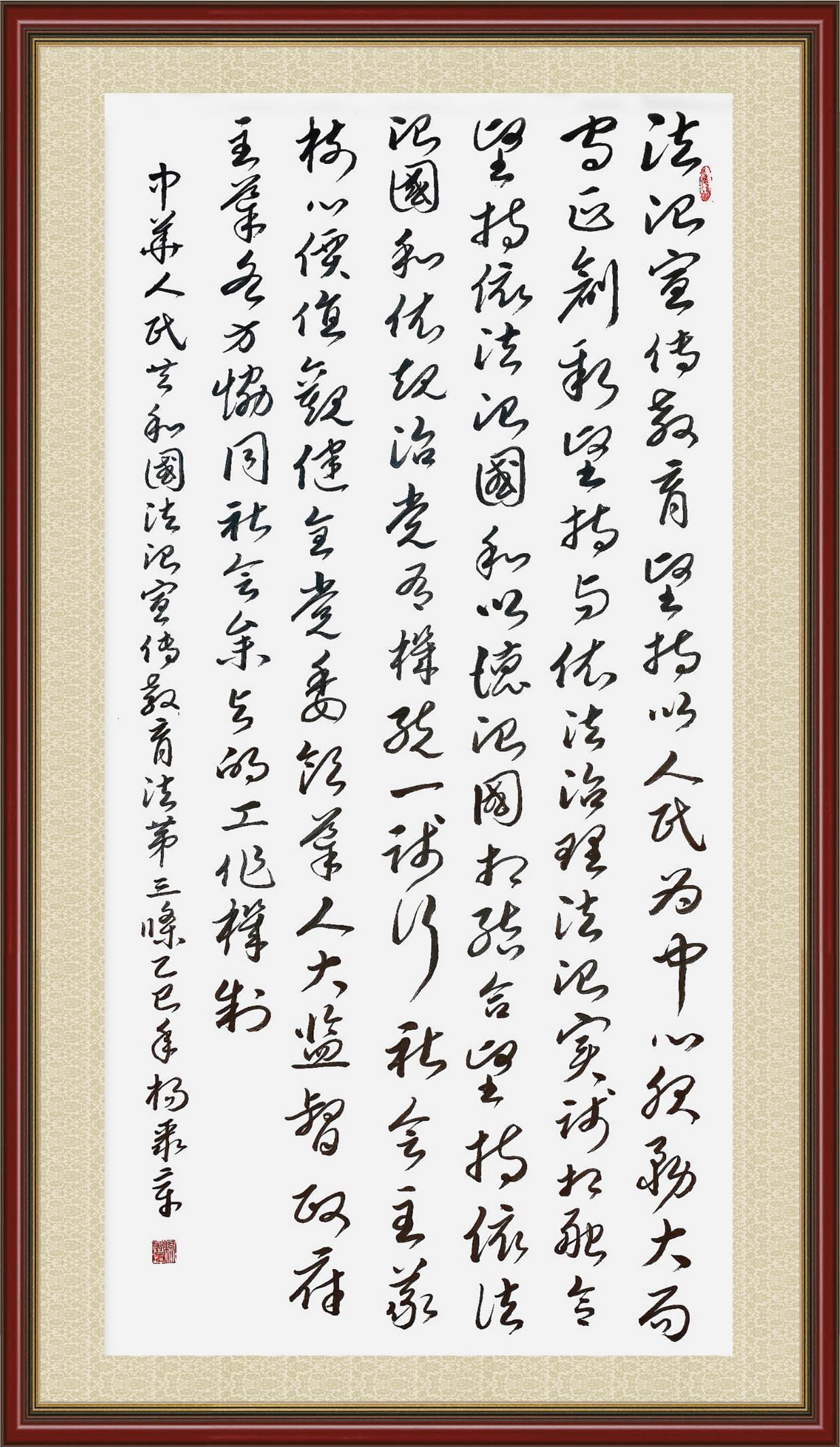 2020年7月11日,由法治日報(bào)社主辦的“書·法”系列活動正式啟動,先后書寫《中華人民共和國民法典》《中華人民共和國憲法》《中華人民共和國民營經(jīng)濟(jì)促進(jìn)法》等21部法律法規(guī)。