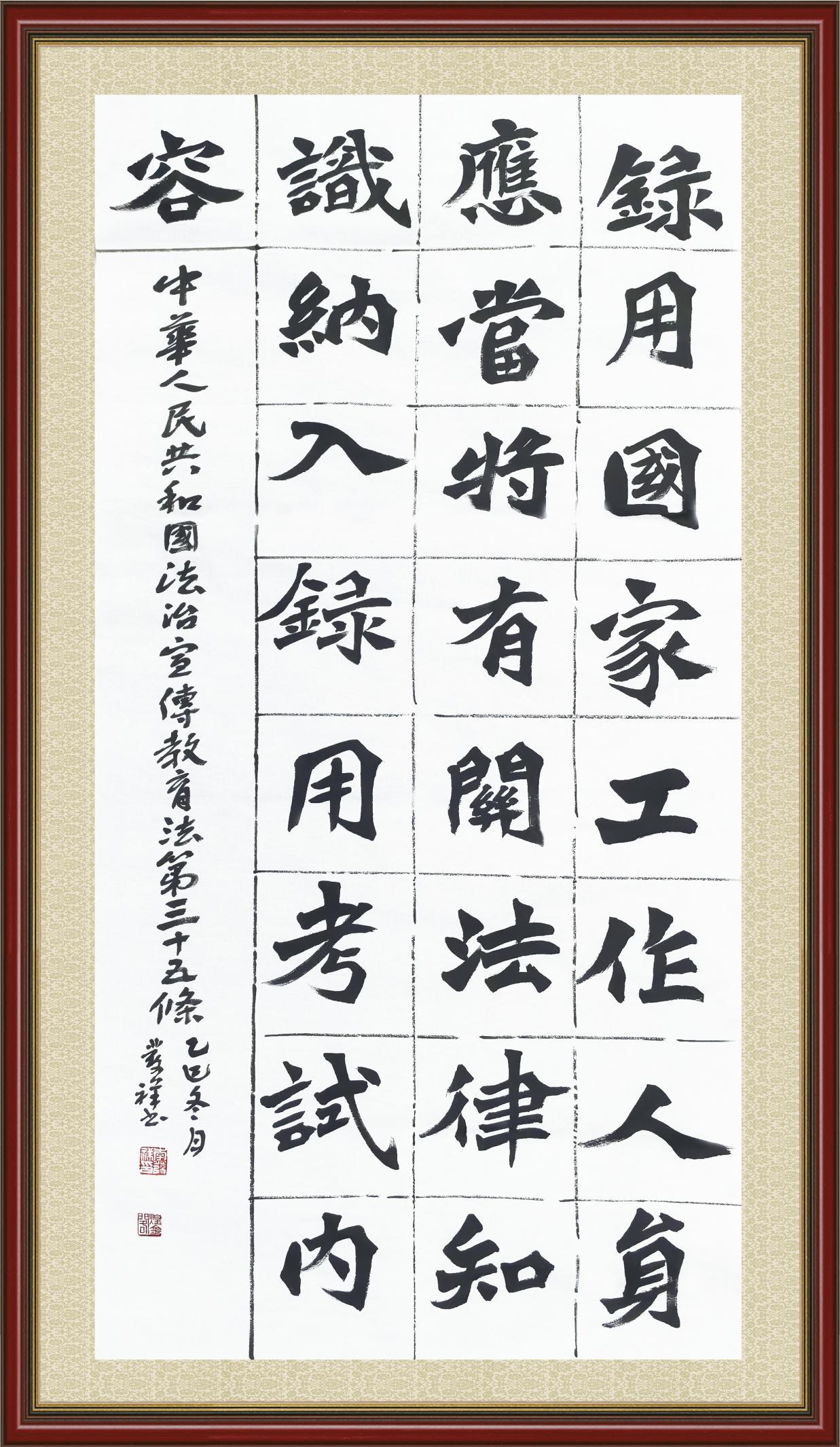 2020年7月11日,由法治日?qǐng)?bào)社主辦的“書·法”系列活動(dòng)正式啟動(dòng),先后書寫《中華人民共和國民法典》《中華人民共和國憲法》《中華人民共和國民營經(jīng)濟(jì)促進(jìn)法》等21部法律法規(guī)。