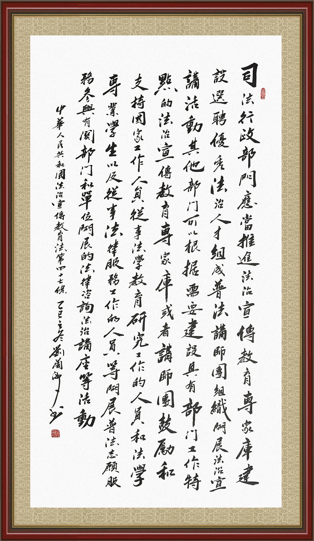 2020年7月11日,由法治日?qǐng)?bào)社主辦的“書(shū)·法”系列活動(dòng)正式啟動(dòng),先后書(shū)寫《中華人民共和國(guó)民法典》《中華人民共和國(guó)憲法》《中華人民共和國(guó)民營(yíng)經(jīng)濟(jì)促進(jìn)法》等21部法律法規(guī)。