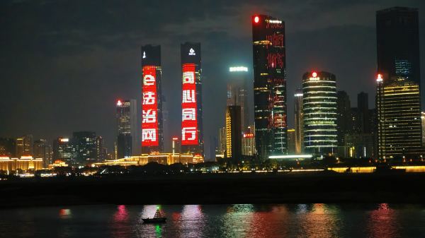 法治之光照亮美好生活。夜晚的南昌,一場大型燈光秀上演,在贛江兩岸標志性建筑戶外LED大屏幕墻上,滾動播放著網絡文明、網絡法治等主題宣傳標語、動圖、微視頻等,“e法治網 同心同行”的宣傳標語,更是吸引了眾多市民駐足觀看。