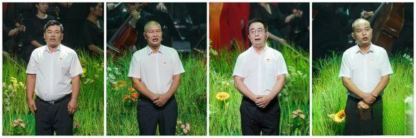 基層村干部鞏保雄(左一)、高泉偉(左二)、俞小平(右二)和施金通(右一)走上舞臺(tái),深情講述《新時(shí)代——我做鄉(xiāng)村振興答卷人》