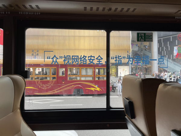 在網(wǎng)絡(luò)普法公交的車窗上,也“隱藏”著網(wǎng)絡(luò)普法金句——“眾”視網(wǎng)絡(luò)安全,“指”為幸福一點(diǎn)!隨著車輛在大街小巷間穿梭,沉浸式學(xué)法帶給每位乘客全新的體驗(yàn),普法真正“動(dòng)”了起來。