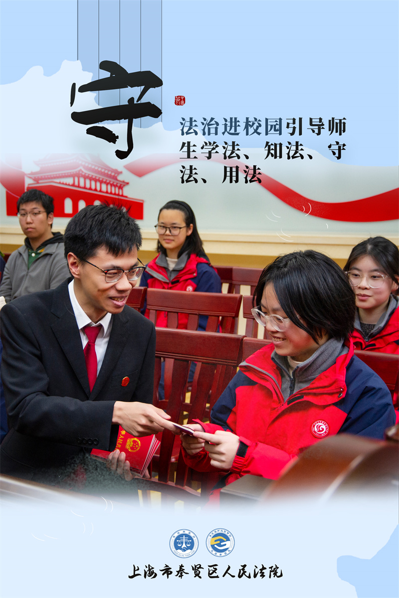 在上海市奉賢法院奉城法庭的法治進(jìn)校園教學(xué)點——奉城鎮(zhèn)曙光中學(xué)內(nèi),法官助理正在向高二的同學(xué)們分發(fā)憲法宣傳冊,并通過釋法析理引導(dǎo)同學(xué)們學(xué)法、知法、守法、用法,在心中播下法治的種子。