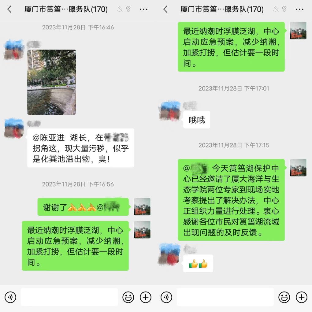 “你看,微信群里有人反映小區(qū)門口的湖水里有疑似化糞池溢出物,我們核實后啟動了應(yīng)急預(yù)案,筼筜湖保護(hù)中心邀請專家實地考察后給出了解決方案。”陳亞進(jìn)指著手機(jī)屏幕向記者介紹道。在這個名為“廈門市筼筜藍(lán)志愿服務(wù)隊”的微信群中,時不時有人@湖長反映問題,“這些都是我們志愿服務(wù)隊的骨干,他們發(fā)現(xiàn)問題就@我,我上報給筼筜湖保護(hù)中心,由他們來解決問題。”