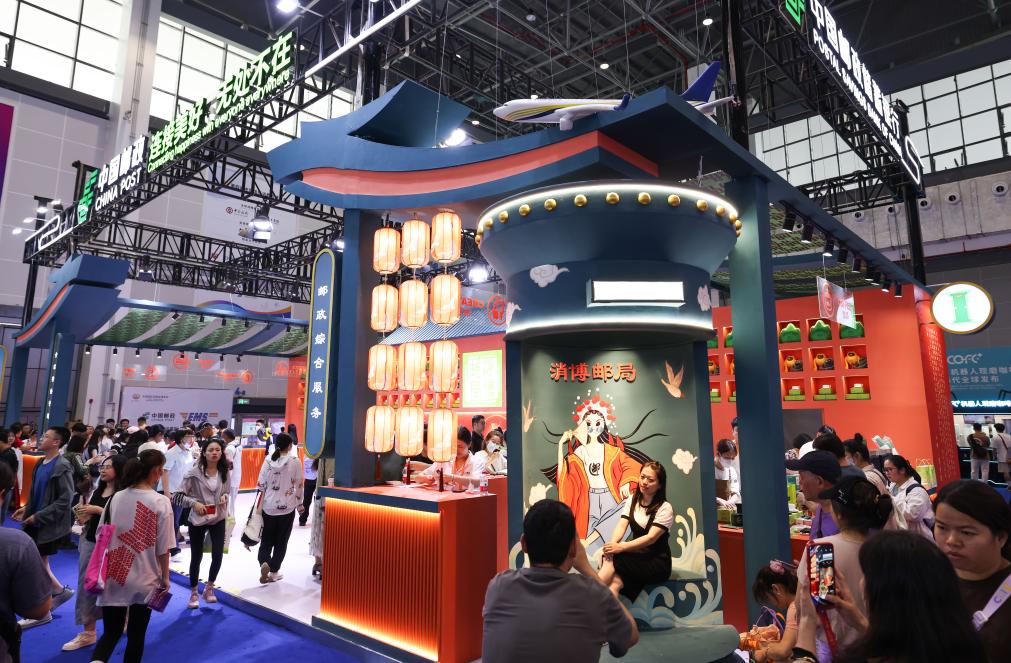 消博郵局是“消博護照”的指定發(fā)放點之一。今年消博郵局運用傳統(tǒng)的云紋、祥龍等國風元素貫穿整體,同時將消博會吉祥物“元元、宵宵”融入郵政國潮IP設計,打造國潮風尚消博郵局,凸顯多元化、年輕化、現(xiàn)代化的郵政品牌新形象,引來不少人駐足觀賞、互動。