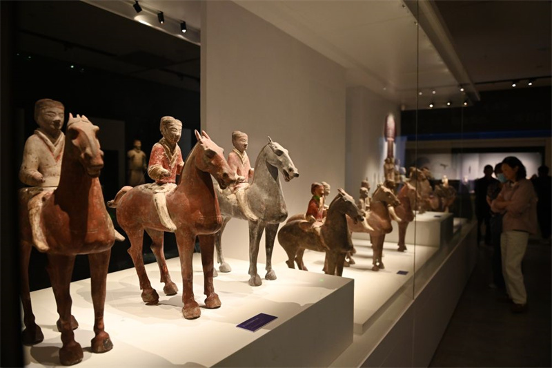 2024年5月6日,觀眾在陜西歷史博物館秦漢館參觀陜西咸陽楊家灣漢墓出土的西漢彩繪陶俑。新華社記者 李一博 攝