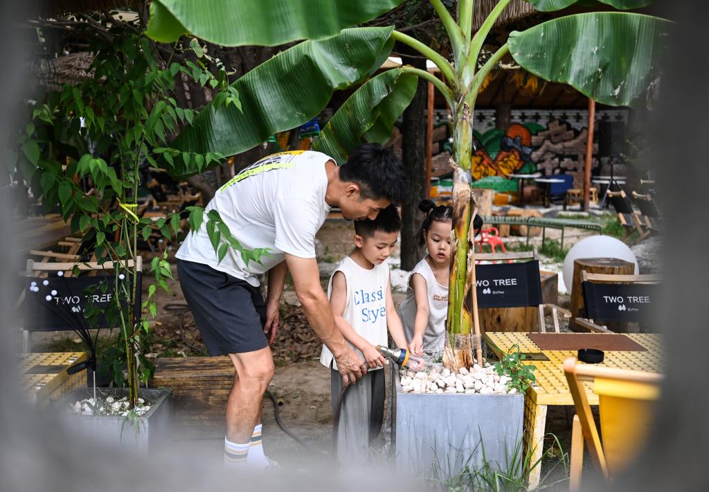 6月20日,土錘咖啡館服務員與小游客在咖啡館內(nèi)為植物澆水。新華社記者 蔡湘鑫 攝