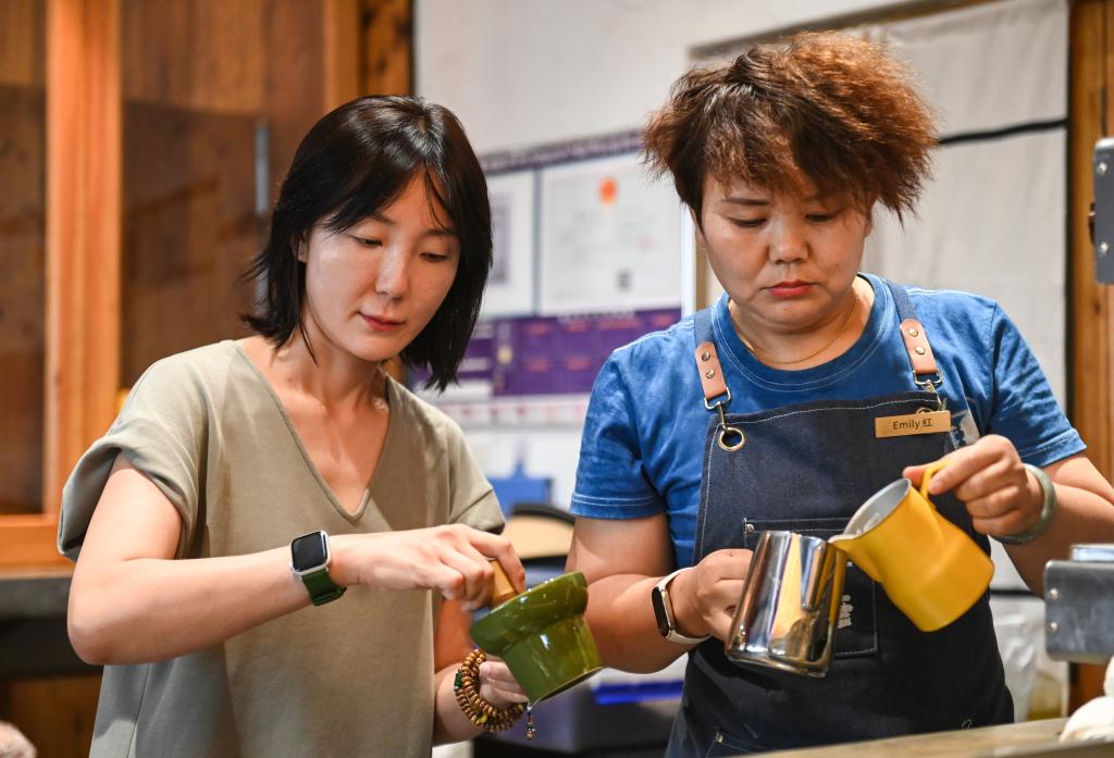6月20日,土錘咖啡主理人王繪婷(左)與服務員在店內(nèi)制作咖啡。新華社記者 蔡湘鑫 攝