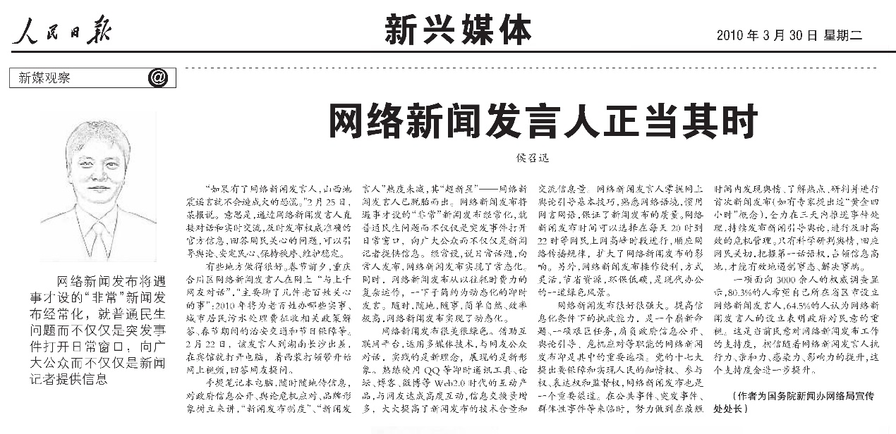 2010年3月30日,《人民日報》刊發(fā)《網(wǎng)絡新聞發(fā)言人正當其時》。