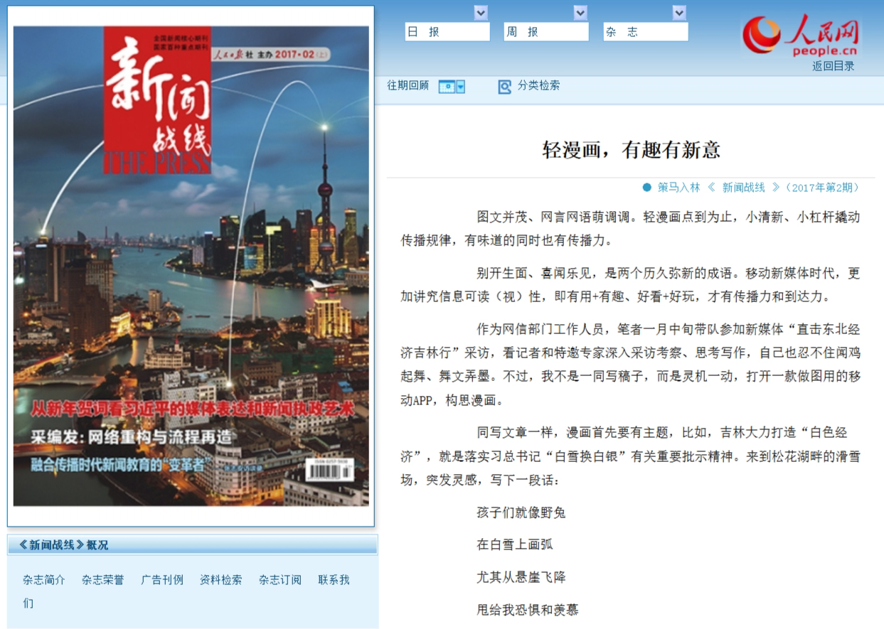 人民日報社《新聞戰(zhàn)線》雜志2017年第2期刊發(fā)《輕漫畫,有趣有新意》。