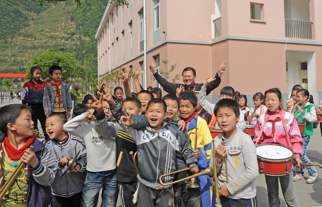 2011年4月,參加第四屆全國專家博客筆會,采訪四川災后重建成果時與孩子們在一起。