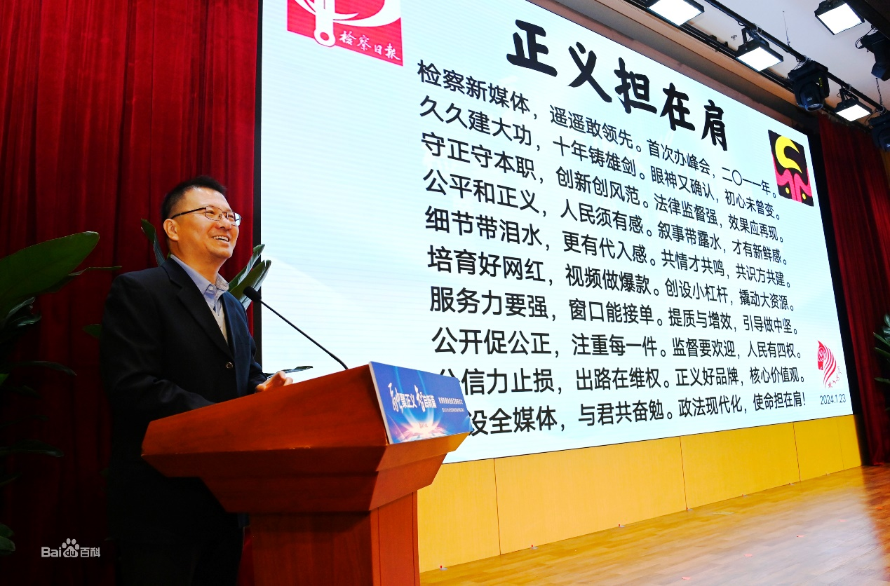 2024年1月23日,參加檢察新媒體創(chuàng)新發(fā)展研討會暨2023年度全國檢察新媒體精品展示活動,發(fā)言提出:我從2013年至今參加過6屆檢察日報社新媒體活動,是資深粉絲,有深厚感情。檢察日報社團結(jié)檢察機關新媒體同仁秉承“強化法律監(jiān)督維護公平正義”宗旨,久久為功,十年鑄劍,成功打造了“正義”新媒體融媒體品牌,令人備感振奮、備受鼓舞。在新時代新征程上,希望“正義”新媒體融媒體守正創(chuàng)新,注重共情共鳴,集結(jié)社會力量,通過短視頻等新傳播方式,充分呈現(xiàn)法律監(jiān)督效果,講好政法故事,增強傳播力服務力監(jiān)督力公信力,讓人民群眾在每一個司法案件中感受到公平正義?!墩x擔在肩》:檢察新媒體,遙遙敢領先。首次辦峰會,二〇一一年。久久建大功,十年鑄利劍。眼神又確認,初心未曾變。守正守本職,創(chuàng)新創(chuàng)風范。法律監(jiān)督強,效果應再現(xiàn)。公平和正義,人民須有感。敘事帶露水,才有新鮮感。細節(jié)帶淚水,更有代入感。共情才共鳴,共識方共建。培育好網(wǎng)紅,視頻做爆款。創(chuàng)設小杠桿,撬動大資源。服務力要強,窗口能接單。提質(zhì)與增效,引導做中堅。公開促公正,注重每一件。監(jiān)督要歡迎,人民有四權。公信力止損,出路在維權。正義好品牌,核心價值觀。建設全媒體,與君共奮勉。政法現(xiàn)代化,使命擔在肩。
