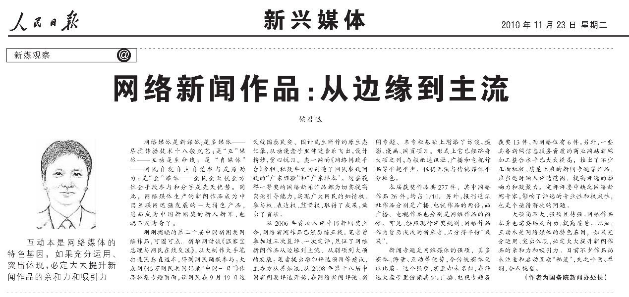 2010年11月23日,《人民日報》刊發(fā)《網(wǎng)絡新聞作品:從邊緣到主流》。