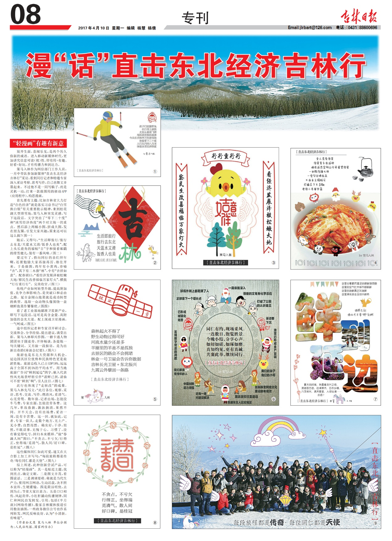2017年1月中旬,帶隊進行全國網(wǎng)絡媒體“直擊東北經(jīng)濟吉林行”采訪,看記者和特邀專家深入采訪寫作,自己也有感而發(fā),通過“輕漫畫”展現(xiàn)所見所想。利用一款作圖APP,構思漫畫,根據(jù)不同內(nèi)容創(chuàng)作十多幅。后撰文,刊于2017年第2期人民日報《新聞戰(zhàn)線》雜志、2017年4月11日《吉林日報》和2017年第4期《網(wǎng)絡傳播》雜志。文章稱:這組“輕漫畫”作品一是貼近主題,找到亮點,確定文眼。二是圖文并茂,看圖說話。三是調(diào)調(diào)要萌,萌就是當代生產(chǎn)力;要用網(wǎng)言網(wǎng)語,生動活潑,絕不照本宣科、生硬灌輸。四是簡潔明快,點到為止,節(jié)省大家注意力。五是口口相傳,風起青萍,小杠桿撬動傳播規(guī)律,同仁和網(wǎng)民自發(fā)轉(zhuǎn)發(fā)、引用,包括《半月談》《網(wǎng)絡傳播》和數(shù)家吉林媒體報道引用數(shù)張插圖,一些政務微信公號也作系列轉(zhuǎn)發(fā),網(wǎng)民反響良好,認為“小清新,有味道,有意義”。