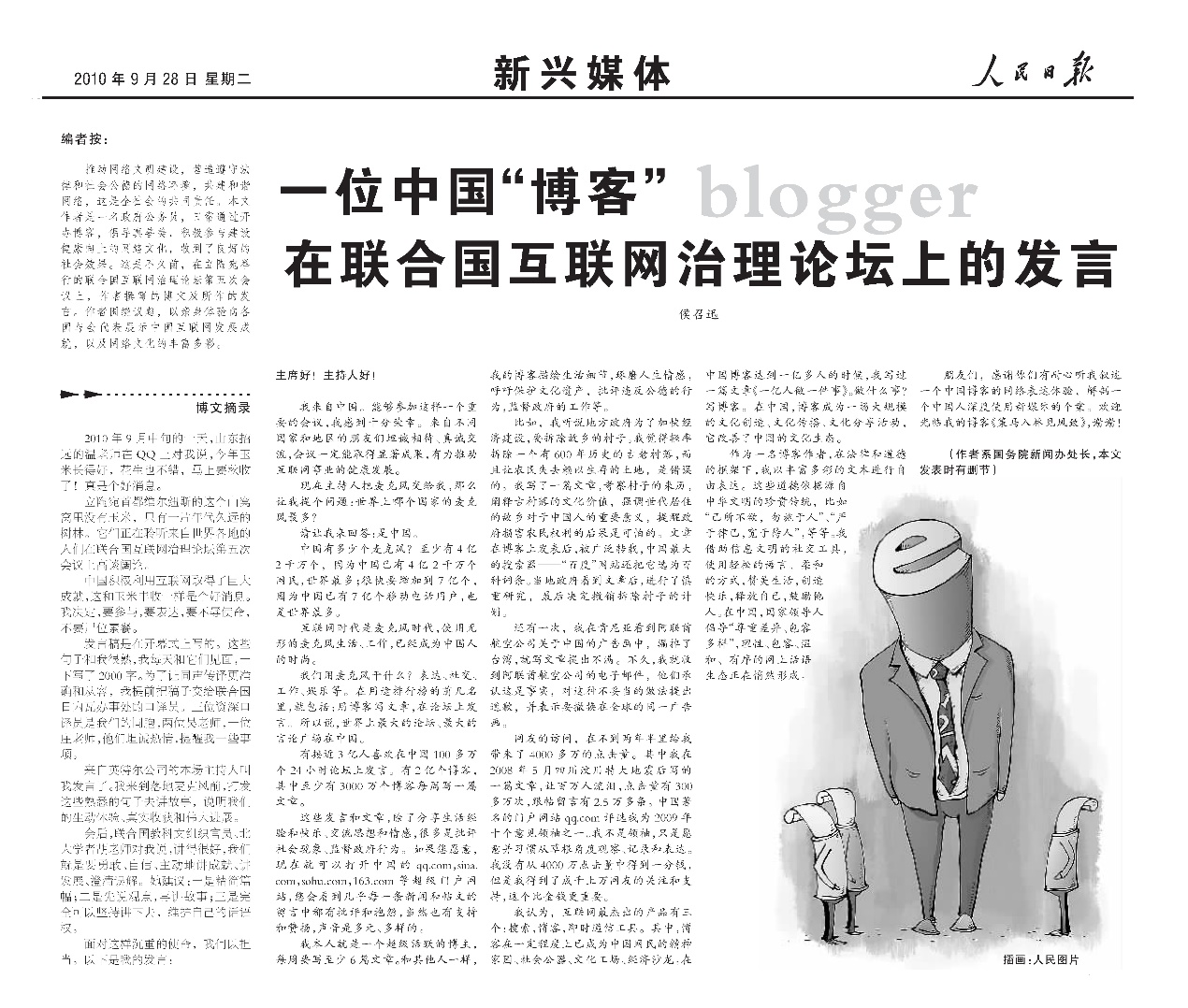 2010年9月28日,《人民日報》刊發(fā)《一位中國博客在聯(lián)合國互聯(lián)網(wǎng)治理論壇上的發(fā)言》。