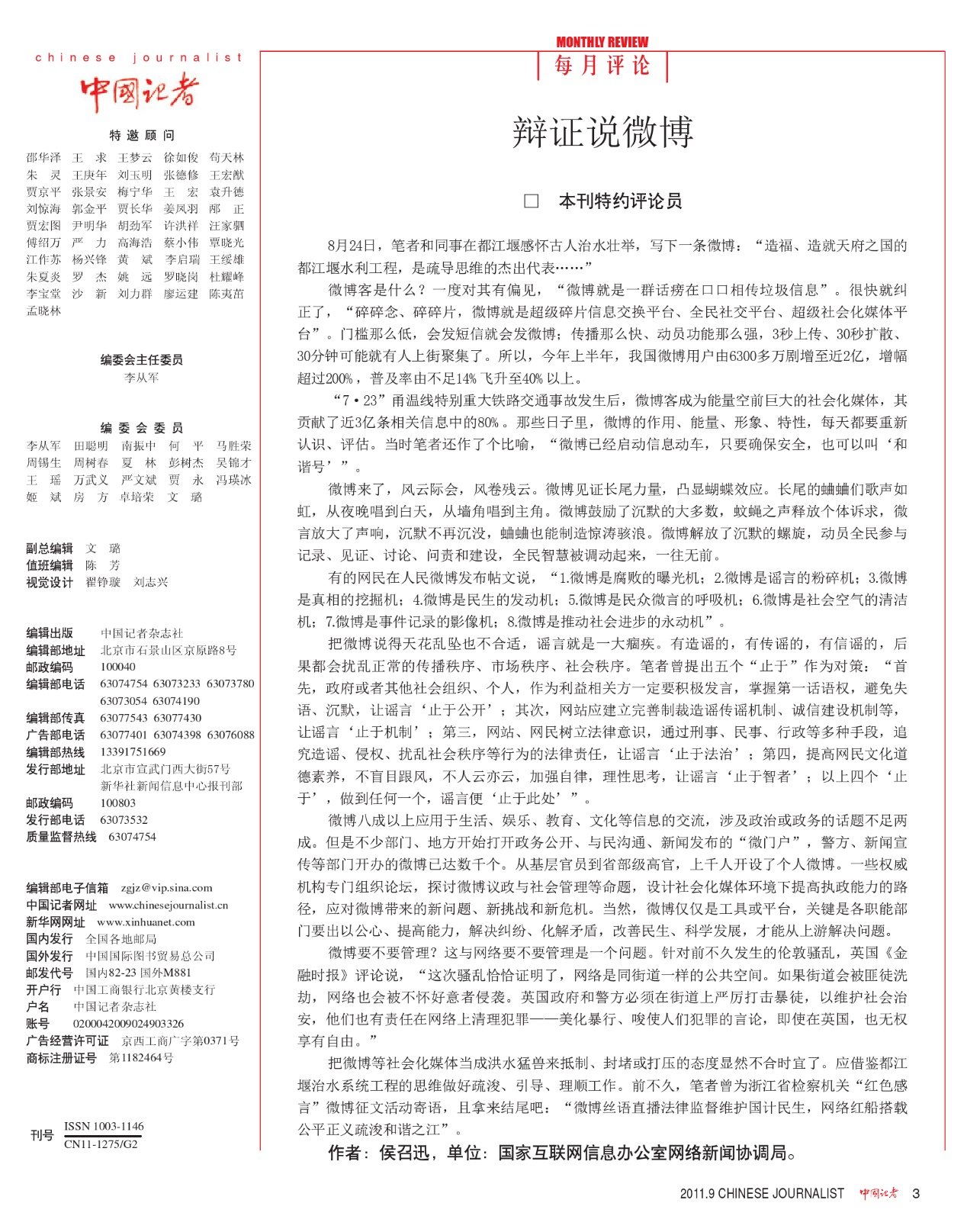《中國(guó)記者》2011年第9期“每月評(píng)論”刊發(fā)《辯證說(shuō)微博》。