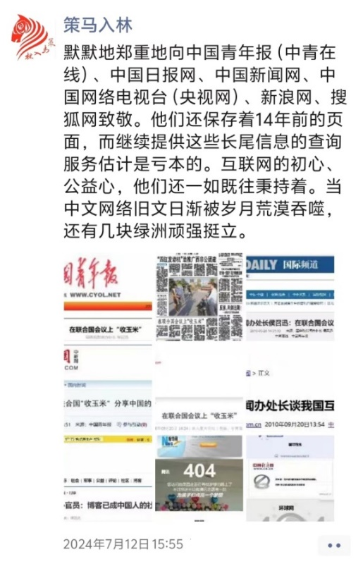 2024年7月3日,我發(fā)了一條朋友圈:前些天看到有人說(shuō)網(wǎng)絡(luò)“崩塌”,有點(diǎn)著慌,馬上去找以前寫的一些帖文,真發(fā)現(xiàn)了問(wèn)題。多年前可以搜到數(shù)千上萬(wàn)條自己寫的稿子或與己有關(guān)的信息,現(xiàn)在去重、有用的所剩不多,還被一些收費(fèi)網(wǎng)站囤去一些,不交錢不讓看。QQ空間日志(騰訊博客)的一千多篇還在,互動(dòng)也在,鏈接卻多成死鏈。新浪博客的一千多篇也在,互動(dòng)沒(méi)了,考慮到博主需要,設(shè)置了備份按鈕,確實(shí)負(fù)責(zé)任。早已停服的博客中國(guó),竟然還能打開。鏈接的新聞網(wǎng)頁(yè)還在的,有新浪網(wǎng)、中國(guó)青年報(bào)中青在線、中國(guó)日?qǐng)?bào)網(wǎng)、中國(guó)新聞網(wǎng)、央視網(wǎng)、搜狐網(wǎng)等。包括人民網(wǎng)、新華網(wǎng)、中國(guó)網(wǎng)、國(guó)際在線、央廣網(wǎng)等大多數(shù)新聞網(wǎng)站及騰訊新聞、網(wǎng)易新聞、鳳凰新聞等,已經(jīng)404或403,而我最多的鏈接是人民網(wǎng)的,真是遺憾。對(duì)低效益的冷寂長(zhǎng)尾內(nèi)容,很多網(wǎng)站平臺(tái)不愿再運(yùn)營(yíng)維護(hù),便卸載斷服?!盎ヂ?lián)網(wǎng)是有記憶的”,這話需要加以限定了,十年記憶就不容易,“永久”“免費(fèi)”已是傳說(shuō)。接下來(lái),有用的盡快備份吧,不管微博微信短視頻啥的,來(lái)有影去無(wú)蹤,或終將煙消云散南柯夢(mèng)。值得敬佩的是一些良心平臺(tái),尚能以公益為重,秉持初心,堅(jiān)持至今,繼續(xù)提供信息服務(wù),不容易不簡(jiǎn)單。