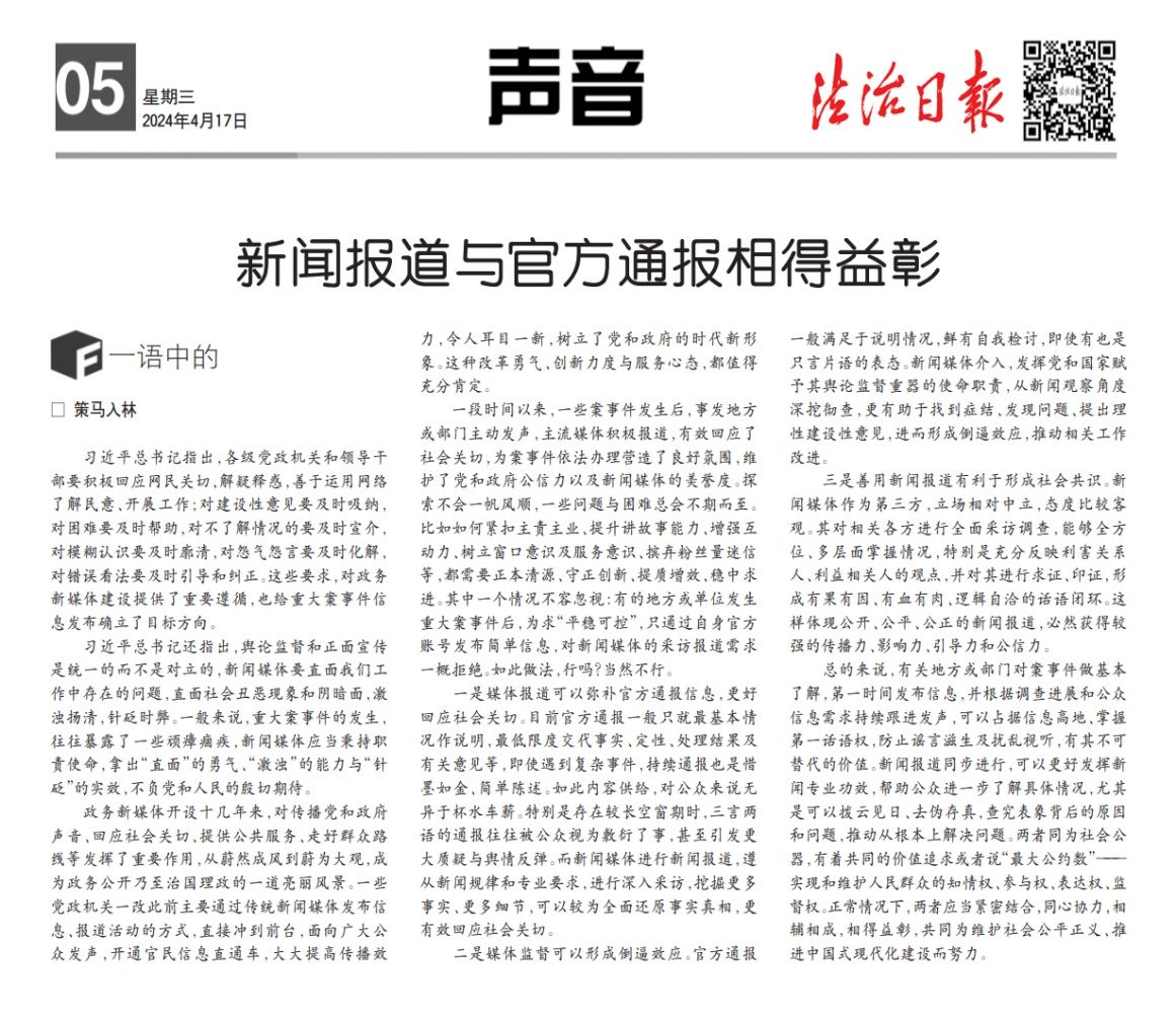 《新聞報(bào)道與官方通報(bào)相得益彰》法治日?qǐng)?bào) 中國(guó)記協(xié) 2024-04-17