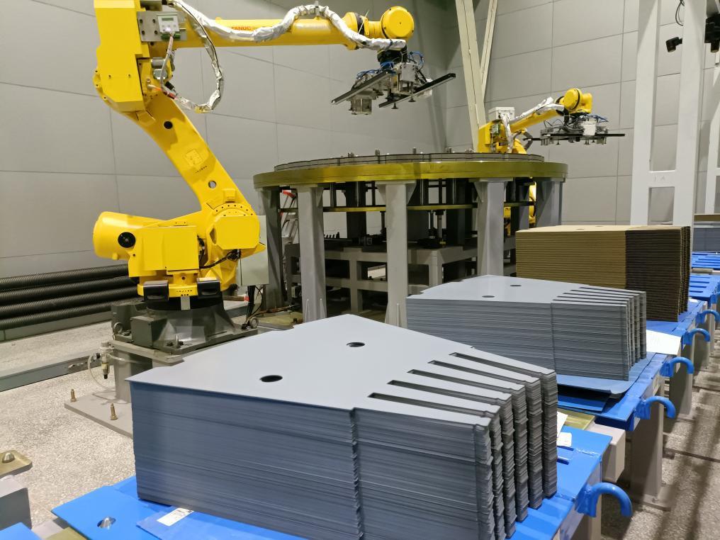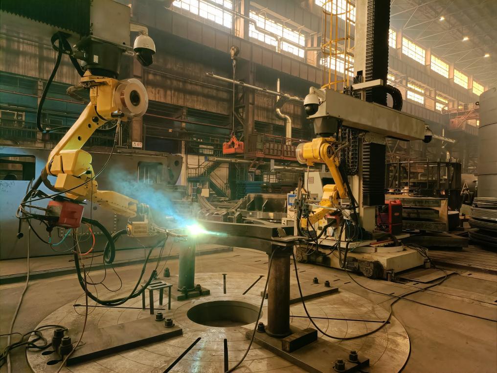 在哈電集團(tuán)哈爾濱電機(jī)廠有限責(zé)任公司冷作分廠,藍(lán)色的弧光在焊花飛濺中“狂舞”,冰冷與熾熱交織在一起,自動(dòng)焊接機(jī)器人在巨大的廠房內(nèi)“忙碌”……